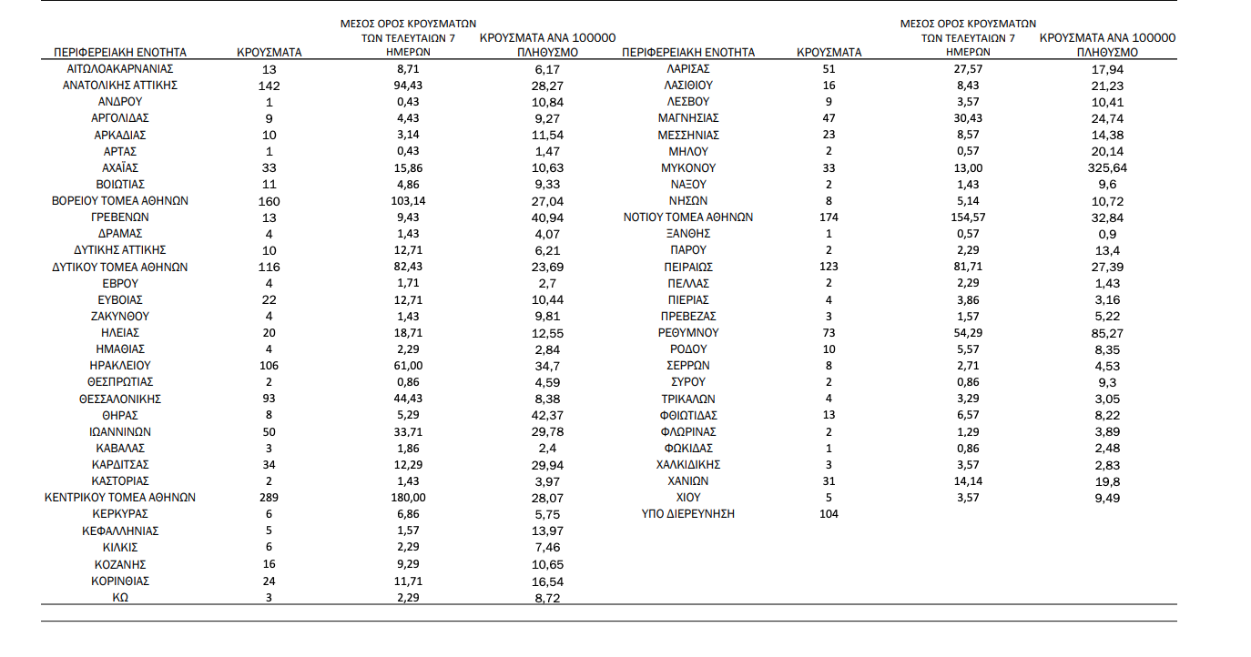 Κατανομή ανακοινωθέντων εγχώριων κρουσμάτων: Από το σύνολο των 1.997 νέων κρουσμάτων του νέου ιού στη χώρα 17 είναι εισαγόμενα εκ των οποίων 5 εντοπίστηκαν κατόπιν ελέγχων στις πύλες εισόδου της χώρας . Η κατανομή των 1.980 νέων εγχώριων κρουσμάτων ανά Περιφερειακή Ενότητα παρουσιάζεται στον κατωτέρω πίνακα.2 Πίνακας 2: Ημερήσιος αριθμός και κρούσματα ανά 100.000 πληθυσμού επιβεβαιωμένων εγχώριων κρουσμάτων COVID-19 ανά περιφερειακή ενότητα στις 09 Ιουλίου 2021