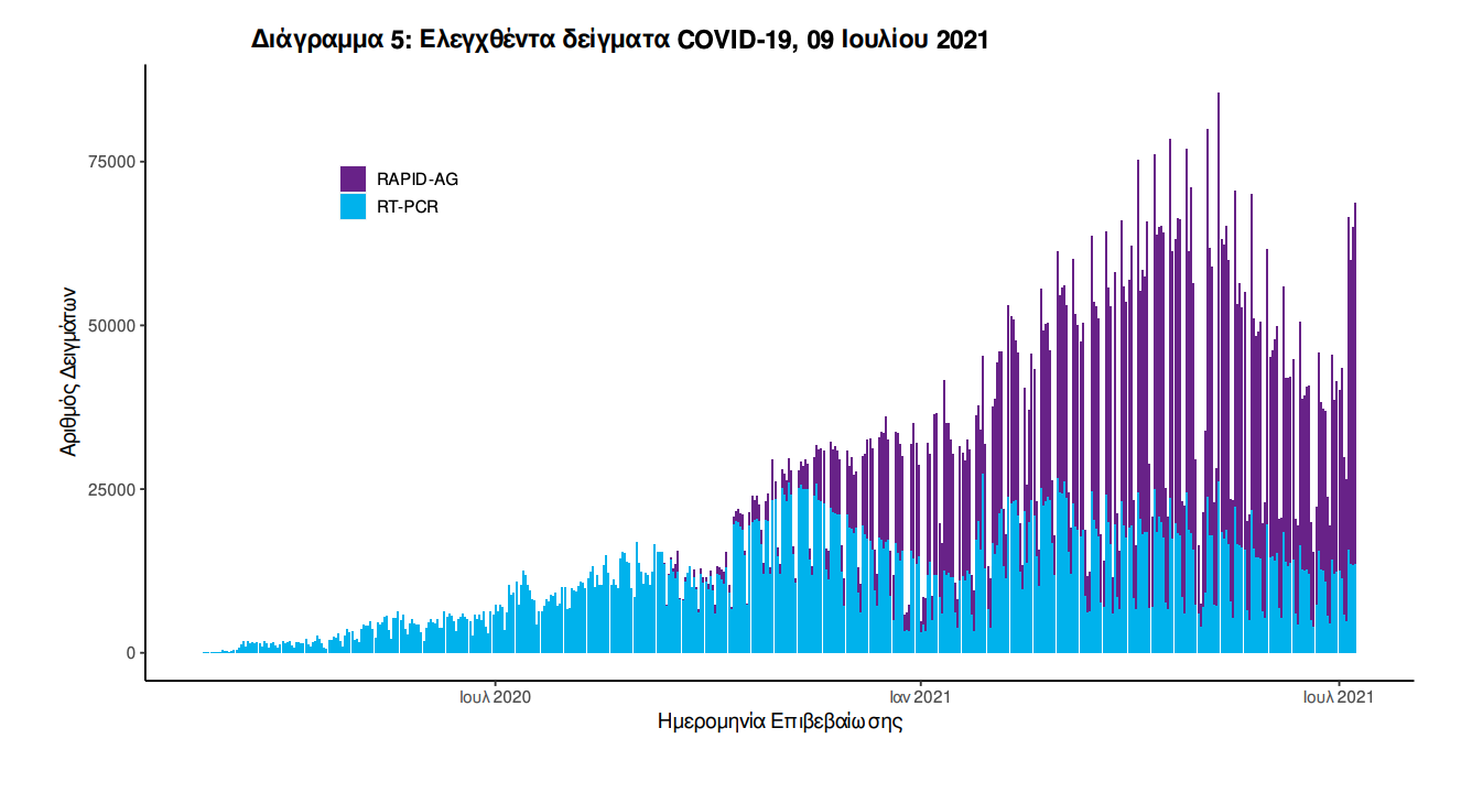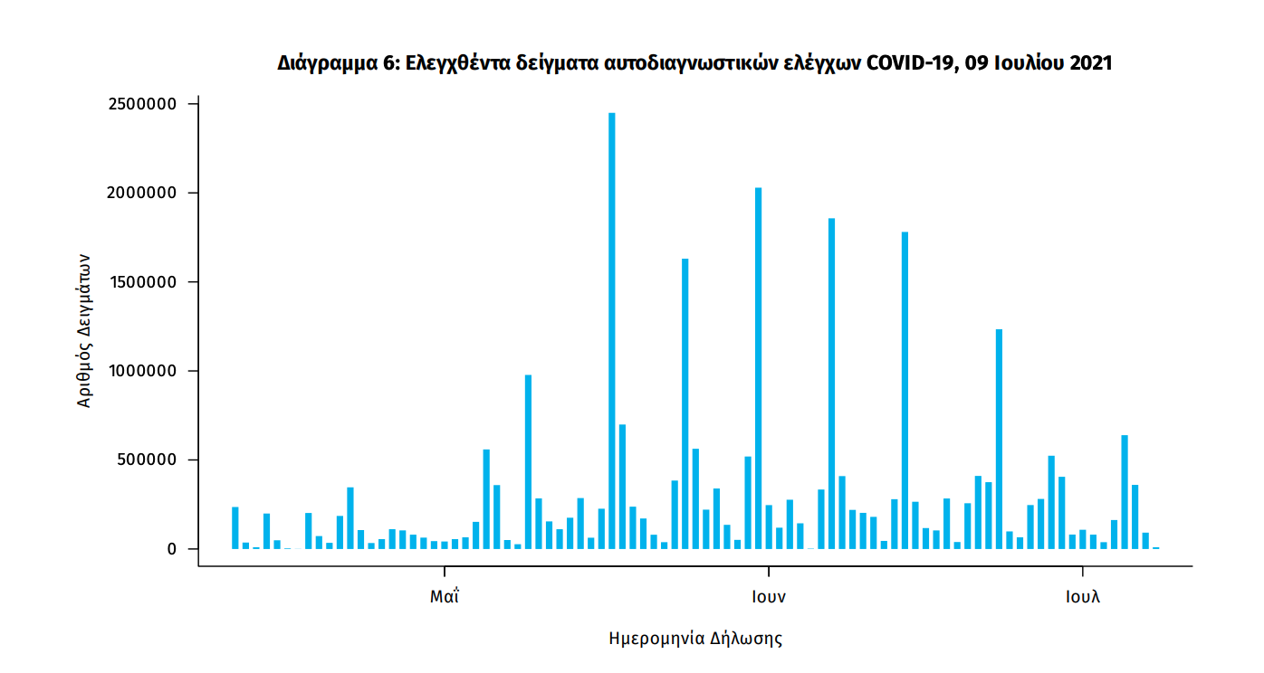 Δείγματα που έχουν ελεγχθεί: Από την 1η Ιανουαρίου 2020 μέχρι σήμερα, στα εργαστήρια που διενεργούν ελέγχους για τον νέο κορωνοϊό (SARS-CoV-2) και που δηλώνουν συστηματικά το σύνολο των δειγμάτων που ελέγχουν, έχουν συνολικά ελεγχθεί 5.517.091 κλινικά δείγματα ενώ από Μονάδες Υγείας και Κλιμάκια του ΕΟΔΥ που διενεργούν ελέγχους Rapid Ag έχουν ελεγχθεί 5.556.970 δείγματα. O μέσος όρος του επταημέρου είναι 51.416 δειγματοληπτικοί έλεγχοι. Αυτοδιαγνωστικοί έλεγχοι (Self-tests): Έως 08 Ιουλίου 2021, έχουν καταγραφεί ηλεκτρονικά 27.476.588 δηλώσεις αποτελέσματος αυτοδιαγνωστικού ελέγχου, ενώ 564.355 άτομα προσήλθαν για επανέλεγχο. Mαζικές Δειγματοληψίες ΕΟΔΥ: Στις 08 Ιουλίου 2021, πραγματοποιήθηκαν 138 δράσεις δειγματοληπτικών ελέγχων από τις Κινητές Ομάδες Υγείας (ΚΟΜΥ) του ΕΟΔΥ, στις οποίες διενεργήθηκαν 19.679 έλεγχοι Rapid Ag και ανευρέθηκαν 444 θετικά (2,26%)
