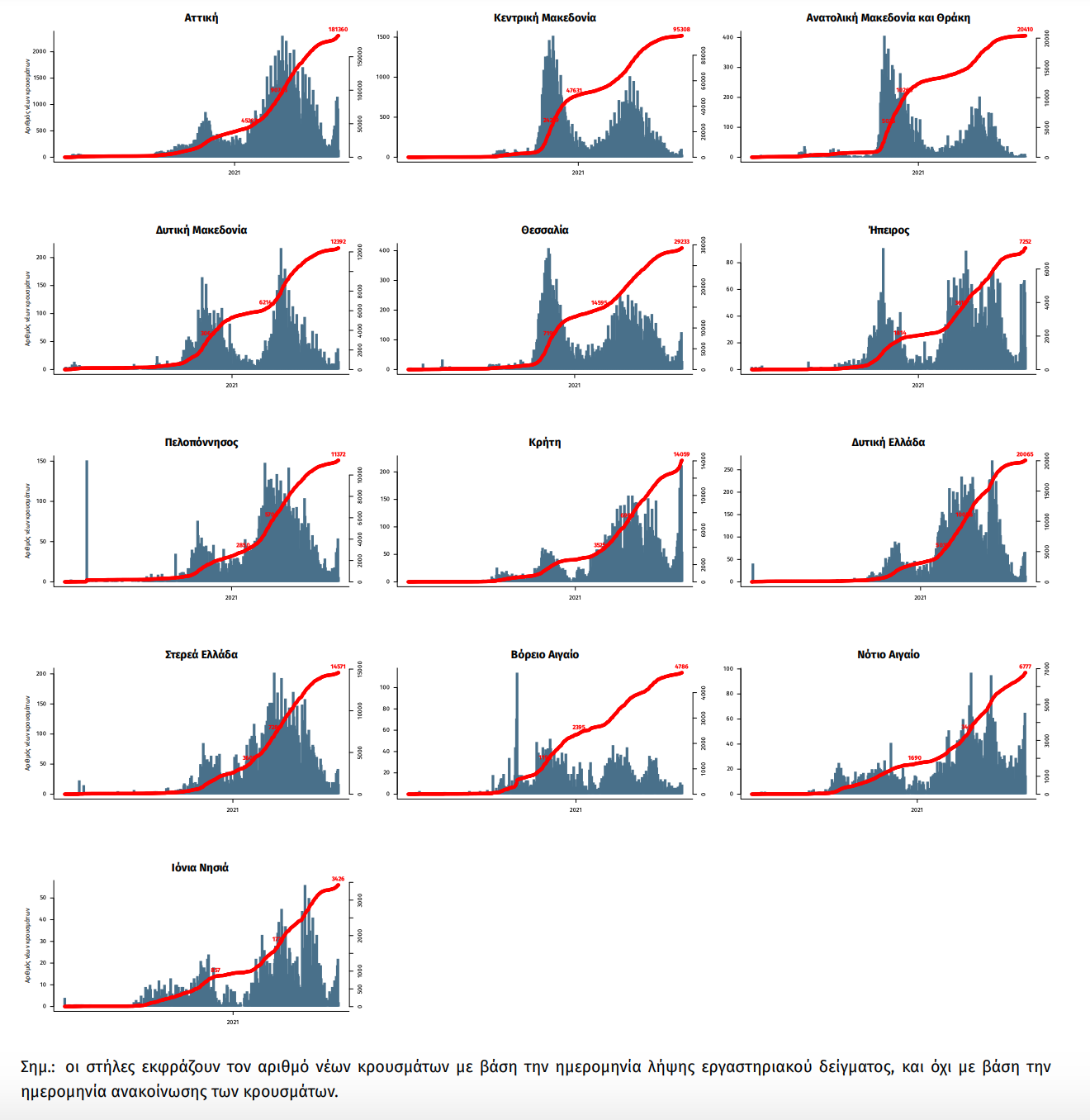 Παράρτημα 1: Επιδημικές καμπύλες κρουσμάτων COVID-19 με βάση την δηλωθείσα διεύθυνση μόνιμης κατοικίας του κρούσματος ή τη διεύθυνση προσωρινής διαμονής για τους τουρίστες και άλλους προσωρινά διαμένοντες στην Ελλάδα. Συμπεριλαμβάνονται τόσο κρούσματα με ιστορικό ταξιδίου όσο και κρούσματα με πιθανή εγχώρια μετάδοση.