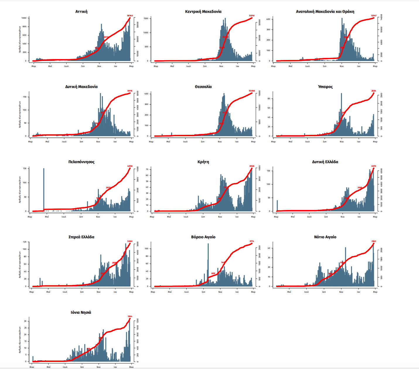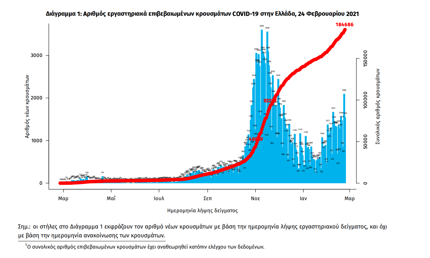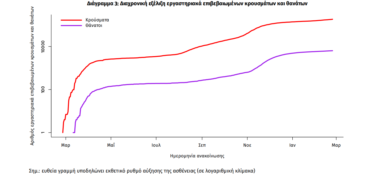 Η διαχρονική εξέλιξη των συνολικών κρουσμάτων και συνολικού αριθμού των θανάτων ασθενών COVID-19 παρουσιάζεται στο ακόλουθο διάγραμμα.