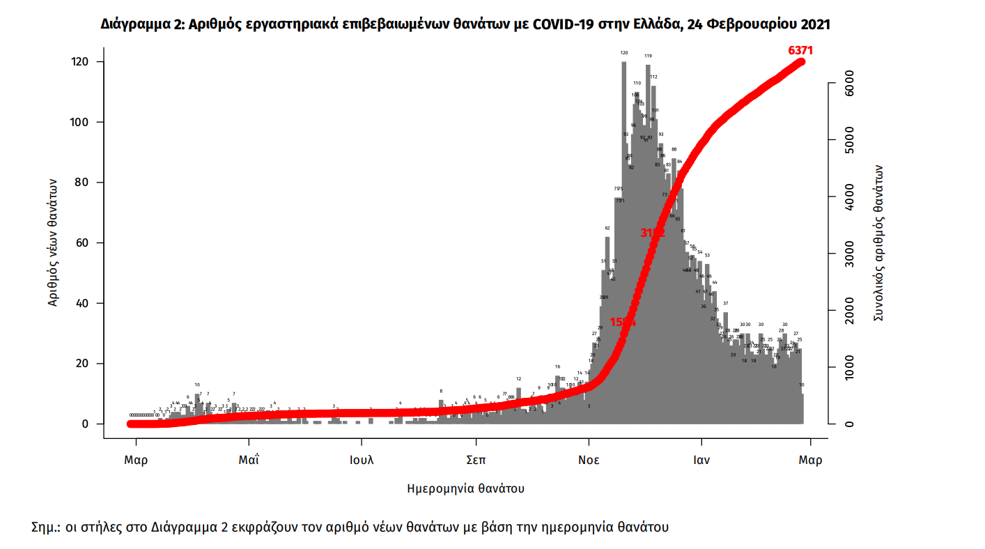 Οι νέοι θάνατοι ασθενών με COVID-19 είναι 28, ενώ από την έναρξη της επιδημίας έχουν καταγραφεί συνολικά 6.371 θάνατοι. Το 95.7% είχε υποκείμενο νόσημα ή/και ηλικία 70 ετών και άνω.