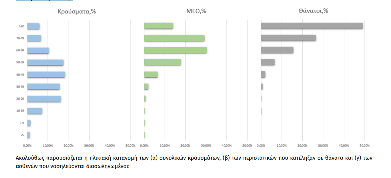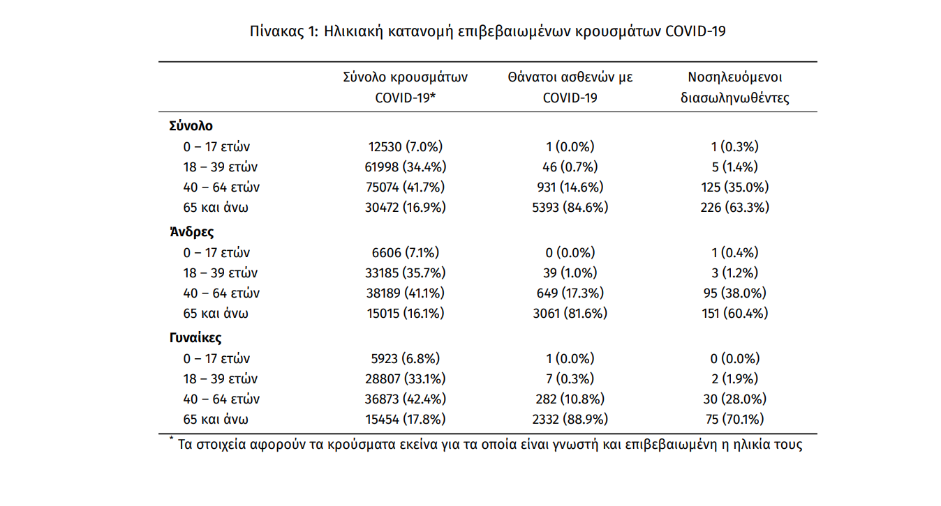 Ο αριθμός των ασθενών που νοσηλεύονται διασωληνωμένοι είναι 357 (69.7% άνδρες). Η διάμεση ηλικία τους είναι 69 έτη. To 86.8% έχει υποκείμενο νόσημα ή/και ηλικία 70 ετών και άνω. Από την αρχή της πανδημίας έχουν εξέλθει από τις ΜΕΘ 1.299 ασθενείς. Οι νέες εισαγωγές2 ασθενών Covid-19 στα νοσοκομεία της επικράτειας είναι 304 (ημερήσια μεταβολή +1.67%). Ο μέσος όρος εισαγωγών του επταημέρου είναι 258 ασθενείς. Hλικιακή κατανομή:Η διάμεση ηλικία των κρουσμάτων είναι 44 έτη (εύρος 0.2 έως 105 έτη), ενώ η διάμεση ηλικία των θανόντων είναι 79 έτη (εύρος 15 έως 103 έτη).