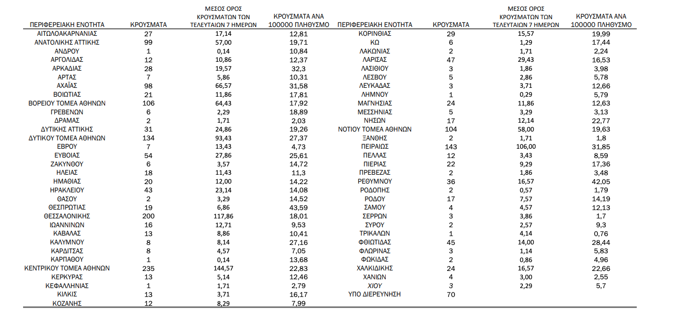 Κατανομή ανακοινωθέντων εγχώριων κρουσμάτων: Από το σύνολο των 1.913 νέων κρουσμάτων του νέου ιού στη χώρα 9 είναι εισαγόμενα εκ των οποίων 5 εντοπίστηκαν κατόπιν ελέγχων στις πύλες εισόδου της χώρας. Η κατανομή των 1.904 νέων εγχώριων κρουσμάτων ανά Περιφερειακή Ενότητα παρουσιάζεται στον κατωτέρω πίνακα.3 Πίνακας 2: Ημερήσιος αριθμός και κρούσματα ανά 100.000 πληθυσμού επιβεβαιωμένων εγχώριων κρουσμάτων COVID-19 ανά περιφερειακή ενότητα στις 24 Φεβρουαρίου 2021