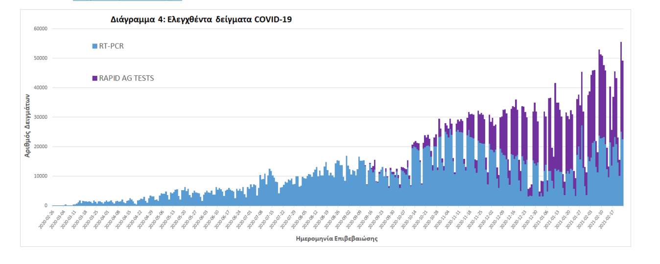 Δείγματα που έχουν ελεγχθεί: Από την 1η Ιανουαρίου 2020 μέχρι σήμερα, στα εργαστήρια που διενεργούν ελέγχους για τον νέο κορωνοϊό (SARS-CoV-2) και που δηλώνουν συστηματικά το σύνολο των δειγμάτων που ελέγχουν, έχουν συνολικά ελεγχθεί 3.561.455 κλινικά δείγματα ενώ από Μονάδες Υγείας και Κλιμάκια του ΕΟΔΥ που διενεργούν ελέγχους Rapid Ag έχουν ελεγχθεί 1.501.431 δείγματα. O μέσος όρος του επταημέρου είναι 38.497 δειγματοληπτικοί έλεγχοι.