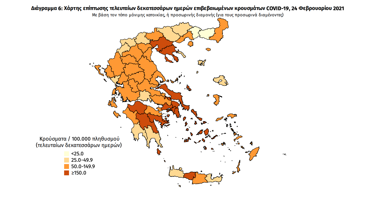 Τα στοιχεία που παρουσιάζονται αφορούν περιστατικά από την επιδημιολογική επιτήρηση της νόσου από το νέο κορωνοϊό (COVID19), με βάση τα δεδομένα που έχουν δηλωθεί στον ΕΟΔΥ και καταγραφεί μέχρι τις 24 Φεβρουαρίου 2021 (ώρα 15:00). Τα νέα εργαστηριακά επιβεβαιωμένα κρούσματα της νόσου που καταγράφηκαν τις τελευταίες 24 ώρες είναι 1.913, εκ των οποίων 5 εντοπίστηκαν κατόπιν ελέγχων στις πύλες εισόδου της χώρας. Ο συνολικός αριθμός των κρουσμάτων ανέρχεται σε 184.686 (ημερήσια μεταβολή +1.0%), εκ των οποίων 51.8% άνδρες.