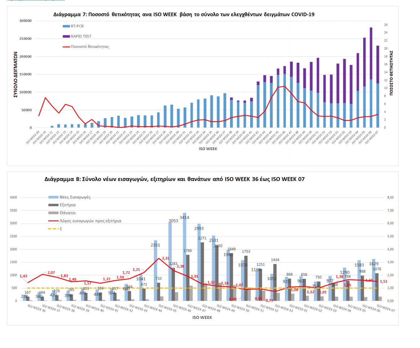 ISO WEEK Την εβδομάδα 15 – 21 Φεβρουαρίου (Iso Week 07) το ποσοστό θετικότητας ήταν 3.40% σε σύνολο 124.268 RT-PCR και 106.623 Rapid Ag τεστ που πραγματοποιήθηκαν.