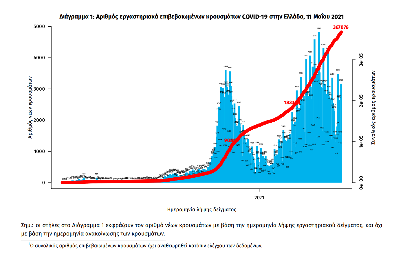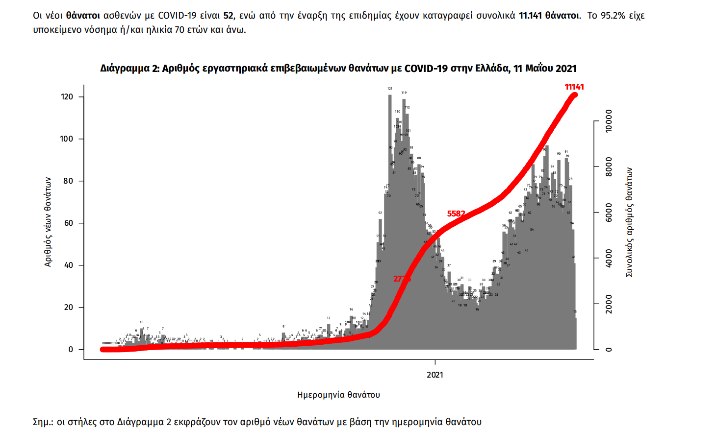 Τα στοιχεία που παρουσιάζονται αφορούν περιστατικά από την επιδημιολογική επιτήρηση της νόσου από το νέο κορωνοϊό (COVID19), με βάση τα δεδομένα που έχουν δηλωθεί στον ΕΟΔΥ και καταγραφεί μέχρι τις 11 Μαΐου 2021 (ώρα 15:00). Τα νέα εργαστηριακά επιβεβαιωμένα κρούσματα της νόσου που καταγράφηκαν τις τελευταίες 24 ώρες είναι 3.197, εκ των οποίων 14 εντοπίστηκαν κατόπιν ελέγχων στις πύλες εισόδου της χώρας.