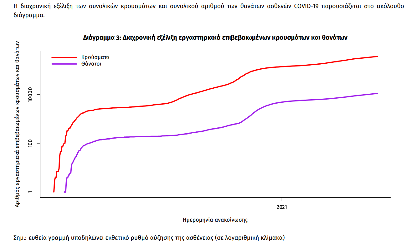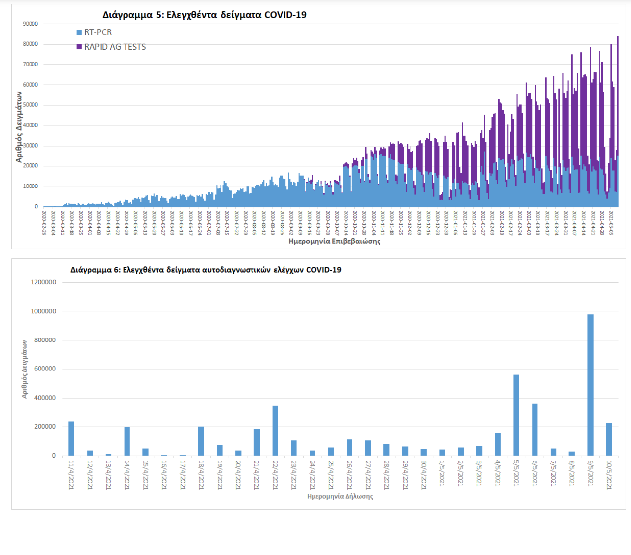 Δείγματα που έχουν ελεγχθεί: Από την 1η Ιανουαρίου 2020 μέχρι σήμερα, στα εργαστήρια που διενεργούν ελέγχους για τον νέο κορωνοϊό (SARS-CoV-2) και που δηλώνουν συστηματικά το σύνολο των δειγμάτων που ελέγχουν, έχουν συνολικά ελεγχθεί 4.794.587 κλινικά δείγματα ενώ από Μονάδες Υγείας και Κλιμάκια του ΕΟΔΥ που διενεργούν ελέγχους Rapid Ag έχουν ελεγχθεί 3.787.668 δείγματα.