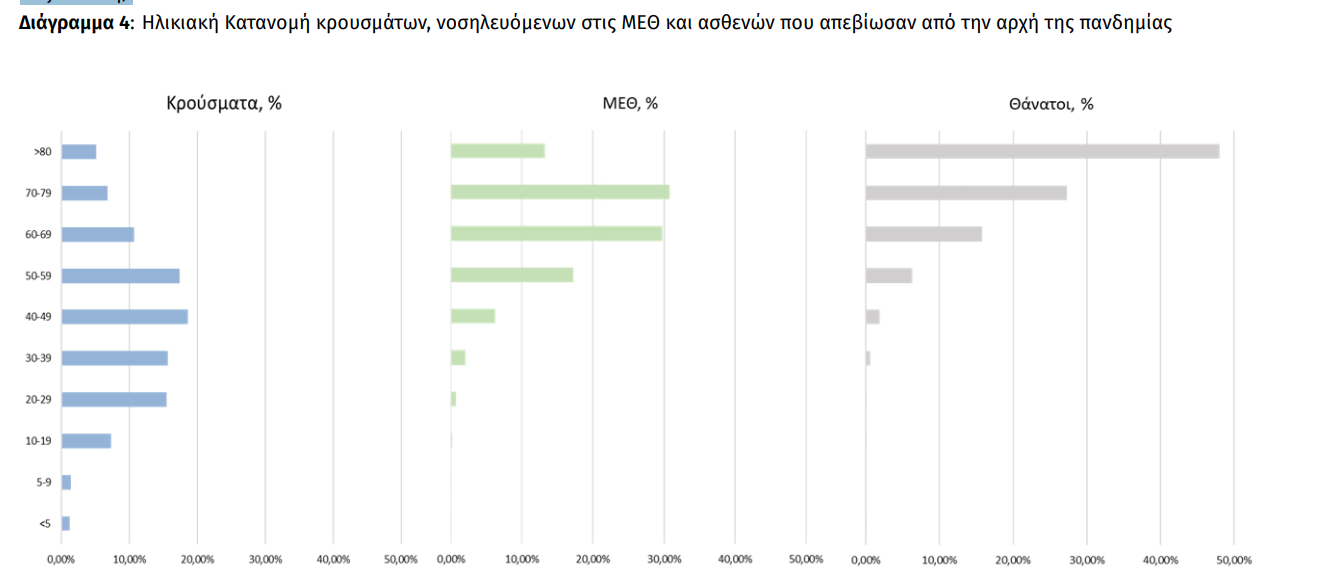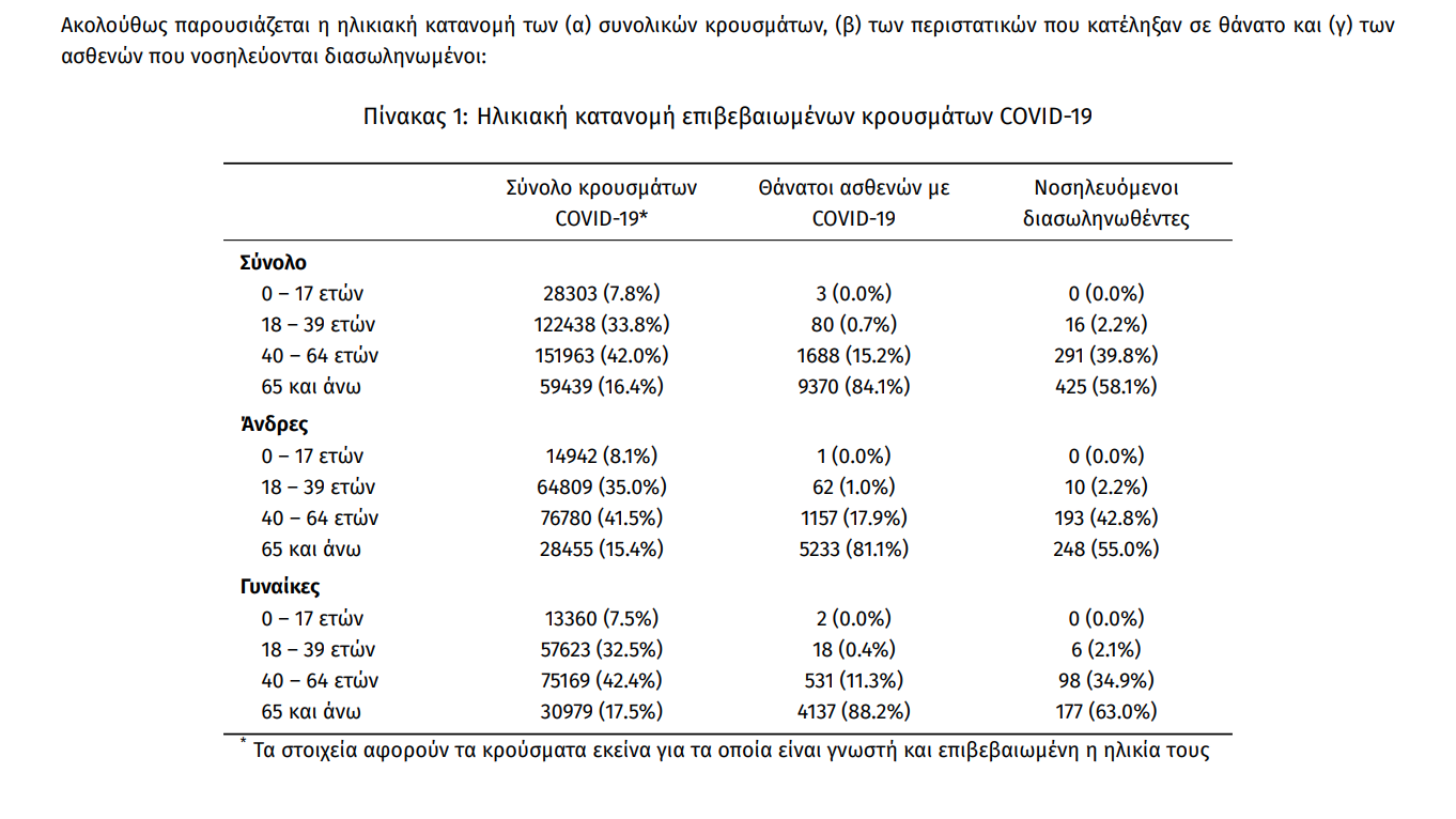 Ο αριθμός των ασθενών που νοσηλεύονται διασωληνωμένοι είναι 732 (61.7% άνδρες). Η διάμεση ηλικία τους είναι 67 έτη. To 83.3% έχει υποκείμενο νόσημα ή/και ηλικία 70 ετών και άνω. Από την αρχή της πανδημίας έχουν εξέλθει από τις ΜΕΘ 2.216 ασθενείς. Οι εισαγωγές2 νέων ασθενών Covid-19 στα νοσοκομεία της επικράτειας είναι 294 (ημερήσια μεταβολή -23.24%). Ο μέσος όρος εισαγωγών του επταημέρου είναι 364 ασθενείς.Η διάμεση ηλικία των κρουσμάτων είναι 44 έτη (εύρος 0.2 έως 106 έτη), ενώ η διάμεση ηλικία των θανόντων είναι 78 έτη (εύρος 0.2 έως 106 έτη).