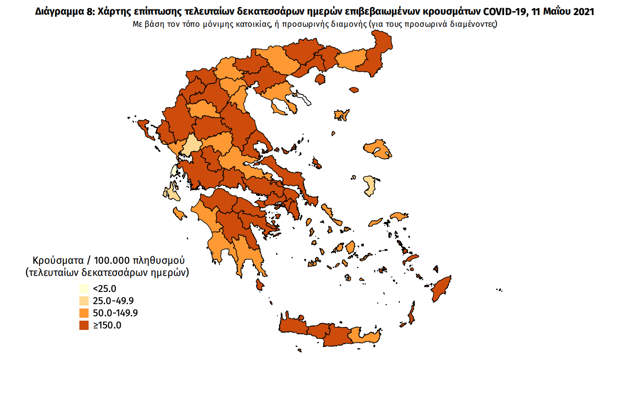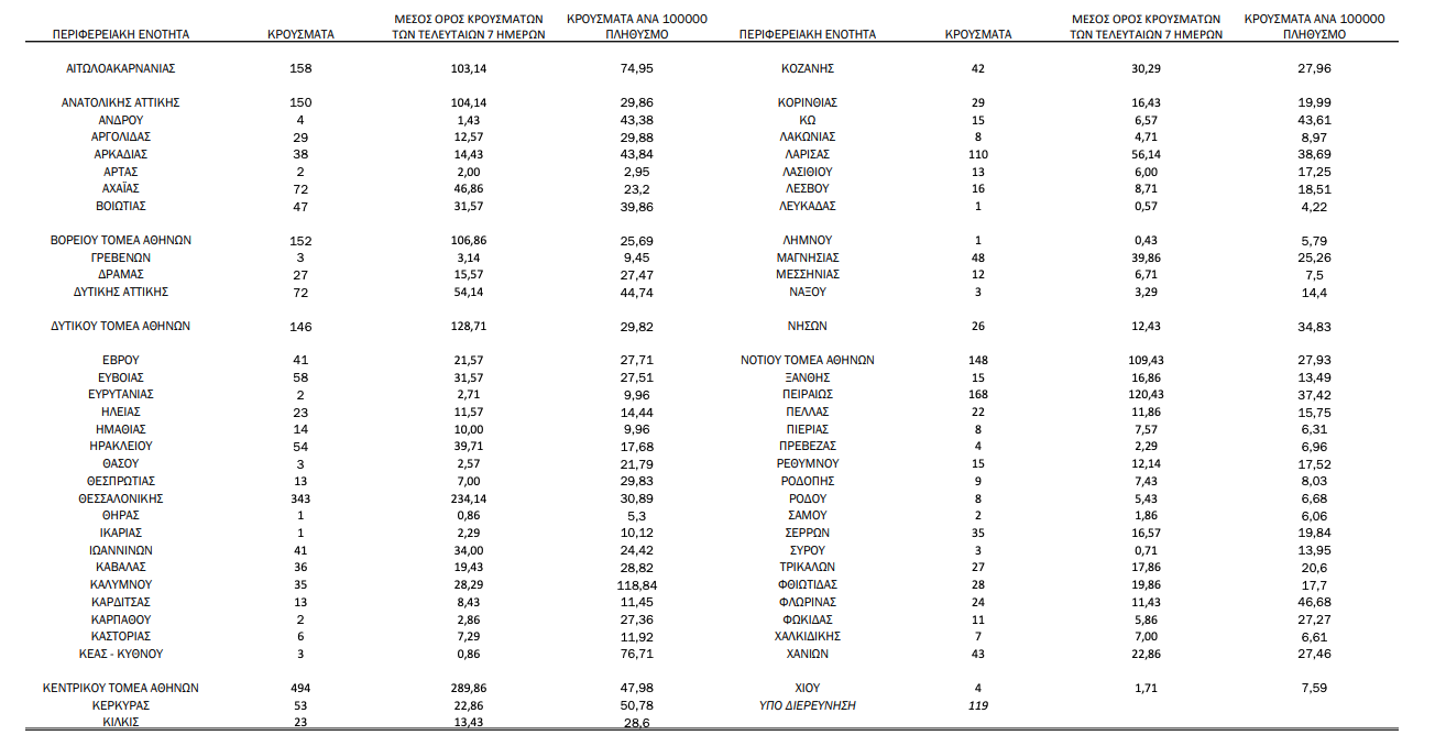 Κατανομή ανακοινωθέντων εγχώριων κρουσμάτων: Από το σύνολο των 3.197 νέων κρουσμάτων του νέου ιού στη χώρα 14 είναι εισαγόμενα εκ των οποίων 14 εντοπίστηκαν κατόπιν ελέγχων στις πύλες εισόδου της χώρας. Η κατανομή των 3.183 νέων εγχώριων κρουσμάτων ανά Περιφερειακή Ενότητα παρουσιάζεται στον κατωτέρω πίνακα.3 Πίνακας 2: Ημερήσιος αριθμός και κρούσματα ανά 100.000 πληθυσμού επιβεβαιωμένων εγχώριων κρουσμάτων COVID-19 ανά περιφερειακή ενότητα στις 11 Μαΐου 2021