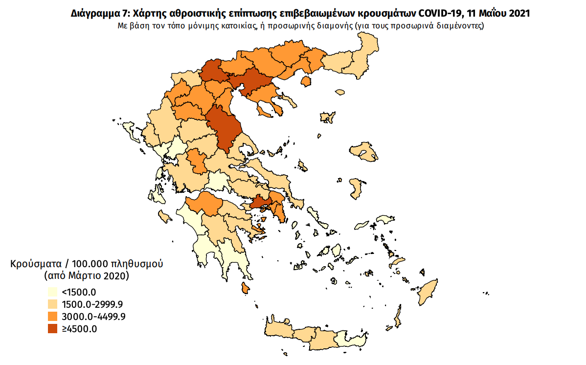 Γεωγραφική διασπορά: Ο χάρτης αποτυπώνει τη γεωγραφική κατανομή των συνολικών κρουσμάτων COVID-19 (από την αρχή της επιδημίας) ανά Περιφερειακή Ενότητα της χώρας, με βάση την δηλωθείσα διεύθυνση μόνιμης κατοικίας του ασθενούς, ή τη διεύθυνση προσωρινής διαμονής για τους τουρίστες και άλλους προσωρινά διαμένοντες στην Ελλάδα. Συμπεριλαμβάνονται τόσο κρούσματα με ιστορικό ταξιδίου (“εισαγόμενα”) όσο και κρούσματα με πιθανή εγχώρια μετάδοση.