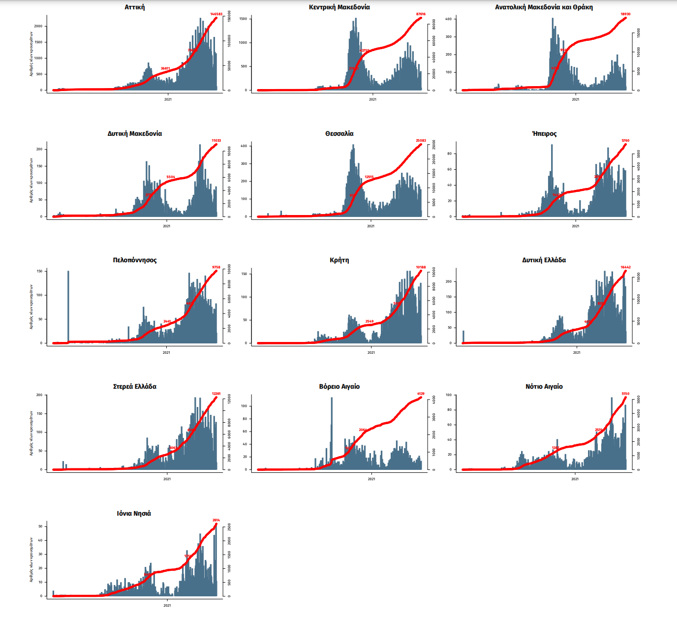 Παράρτημα 1: Επιδημικές καμπύλες κρουσμάτων COVID-19 με βάση την δηλωθείσα διεύθυνση μόνιμης κατοικίας του κρούσματος ή τη διεύθυνση προσωρινής διαμονής για τους τουρίστες και άλλους προσωρινά διαμένοντες στην Ελλάδα. Συμπεριλαμβάνονται τόσο κρούσματα με ιστορικό ταξιδίου όσο και κρούσματα με πιθανή εγχώρια μετάδοση.