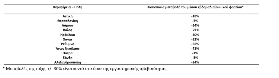 Παράρτημα 2: ΕΘΝΙΚΟ ΔΙΚΤΥΟ ΕΠΙΔΗΜΙΟΛΟΓΙΑΣ ΛΥΜΑΤΩΝ ΕΟΔΥ Ανακοινώνονται τα αποτελέσματα των εργαστηριακών ελέγχων του Εθνικού Δικτύου Επιδημιολογίας Λυμάτων για την επιδημιολογική επιτήρηση του ιού SARS-CoV-2 σε αστικά λύματα, το οποίο λειτουργεί υπό το συντονισμό του ΕΟΔΥ. Τα αποτελέσματα αφορούν στην εβδομάδα 3 έως 9 Μαΐου 2021. Τα δείγματα προέρχονται από την Περιφέρεια Αττικής και τις πόλεις της Θεσσαλονίκης, της Λάρισας, του Βόλου, του Ηρακλείου, των Χανίων, του Ρεθύμνου, του Αγίου Νικολάου Λασιθίου, της Πάτρας, της Ξάνθης και της Αλεξανδρούπολης. Τα δείγματα λαμβάνονται από τις εισόδους των κατά τόπους Μονάδων Επεξεργασίας Λυμάτων και αντιστοιχούν στον πληθυσμό που εξυπηρετείται από αυτές. Πίνακας 1: Ποσοστιαία μεταβολή στη μέση συγκέντρωση του ιικού φορτίου του SARS-CoV-2 στα αστικά λύματα ανά 100.000 κατοίκους την εβδομάδα 3-9 Μαΐου 2021 σε σχέση με την εβδομάδα 26 Απριλίου – 2 Μαΐου 2021.