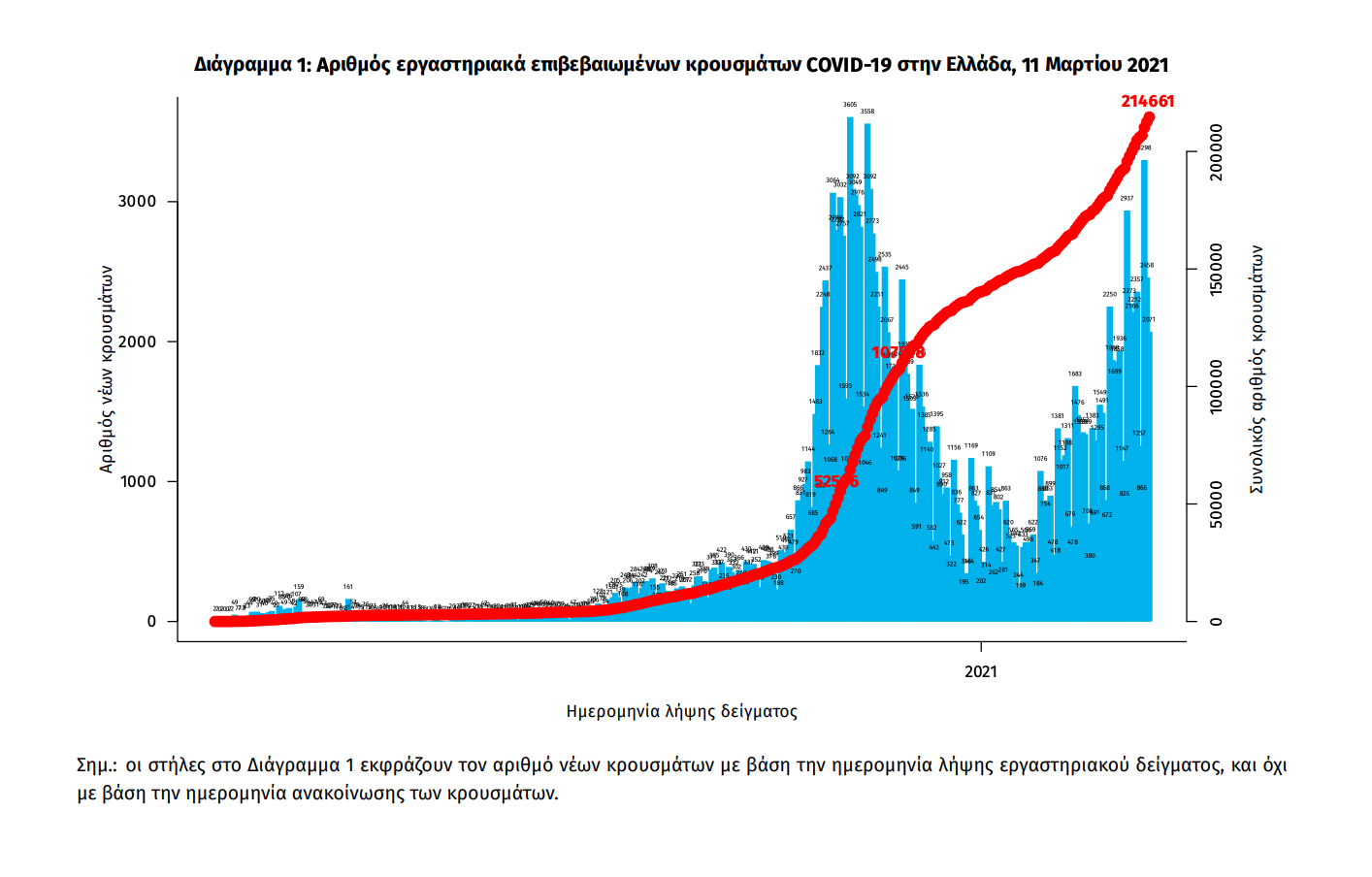 Τα στοιχεία που παρουσιάζονται αφορούν περιστατικά από την επιδημιολογική επιτήρηση της νόσου από το νέο κορωνοϊό (COVID19), με βάση τα δεδομένα που έχουν δηλωθεί στον ΕΟΔΥ και καταγραφεί μέχρι τις 11 Μαρτίου 2021 (ώρα 15:00). Τα νέα εργαστηριακά επιβεβαιωμένα κρούσματα της νόσου που καταγράφηκαν τις τελευταίες 24 ώρες είναι 2.570, εκ των οποίων 7 εντοπίστηκαν κατόπιν ελέγχων στις πύλες εισόδου της χώρας. Ο συνολικός αριθμός των κρουσμάτων ανέρχεται σε 214.661 (ημερήσια μεταβολή +1.2%), εκ των οποίων 51.6% άνδρες.