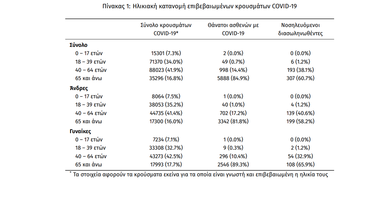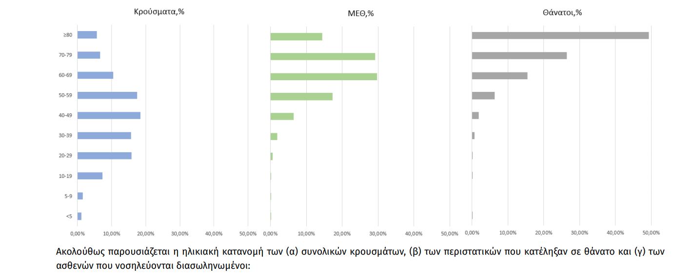 Ο αριθμός των ασθενών που νοσηλεύονται διασωληνωμένοι είναι 506 (67.2% άνδρες). Η διάμεση ηλικία τους είναι 67 έτη. To 83.6% έχει υποκείμενο νόσημα ή/και ηλικία 70 ετών και άνω. Από την αρχή της πανδημίας έχουν εξέλθει από τις ΜΕΘ 1.457 ασθενείς. Οι εισαγωγές1 νέων ασθενών Covid-19 στα νοσοκομεία της επικράτειας είναι 501 (ημερήσια μεταβολή +13.09%). Ο μέσος όρος εισαγωγών του επταημέρου είναι 408 ασθενείς. Hλικιακή κατανομή: Η διάμεση ηλικία των κρουσμάτων είναι 44 έτη (εύρος 0.2 έως 105 έτη), ενώ η διάμεση ηλικία των θανόντων είναι 79 έτη (εύρος 0 έως 103 έτη).