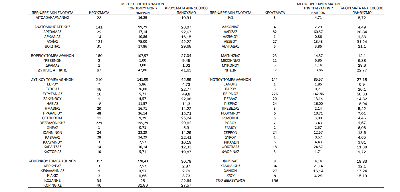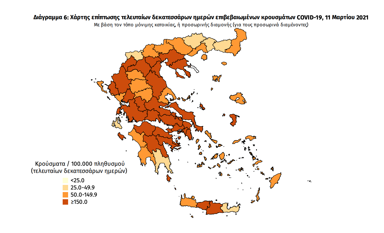 Γεωγραφική διασπορά: Ο χάρτης αποτυπώνει τη γεωγραφική κατανομή των συνολικών κρουσμάτων COVID-19 (από την αρχή της επιδημίας) ανά Περιφερειακή Ενότητα της χώρας, με βάση την δηλωθείσα διεύθυνση μόνιμης κατοικίας του ασθενούς, ή τη διεύθυνση προσωρινής διαμονής για τους τουρίστες και άλλους προσωρινά διαμένοντες στην Ελλάδα. Συμπεριλαμβάνονται τόσο κρούσματα με ιστορικό ταξιδίου (“εισαγόμενα”) όσο και κρούσματα με πιθανή εγχώρια μετάδοση