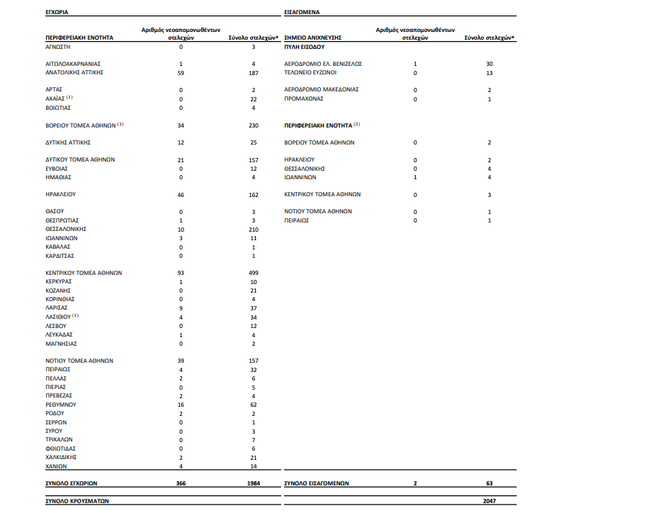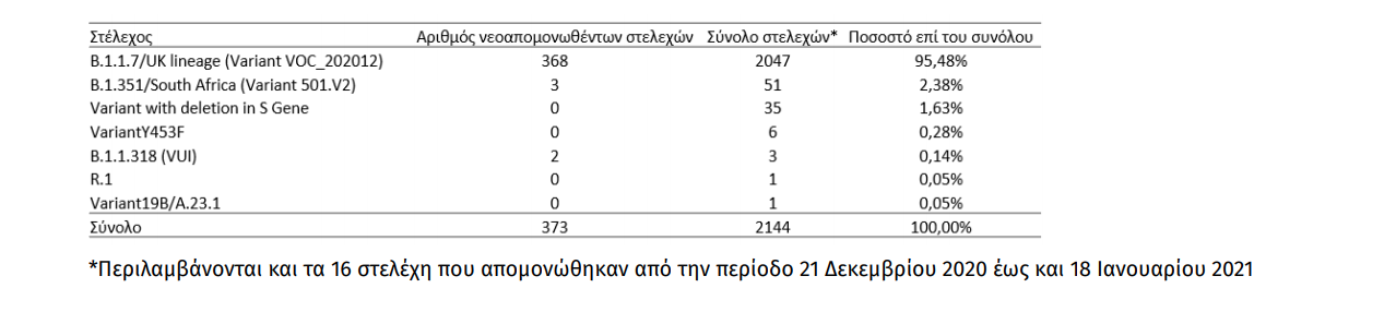 (1): Περιλαμβάνονται και κρούσματα που ανήκουν σε γνωστές συρροές (2): Περιφερειακές Ενότητες όπου ανιχνεύθηκαν θετικά κρούσματα με ιστορικό ταξιδιού από χώρα του εξωτερικού Τα δείγματα για γονιδιωματική ανάλυση έχουν επιλεγεί με συγκεκριμένα εργαστηριακά κριτήρια και δεν προσφέρονται στην παρούσα φάση για εξαγωγή συμπερασμάτων σχετικά με τη διασπορά των στελεχών στον πληθυσμό. *Περιλαμβάνονται και τα 16 στελέχη που απομονώθηκαν από την περίοδο 21 Δεκεμβρίου 2020 έως και 18 Ιανουαρίου 2021