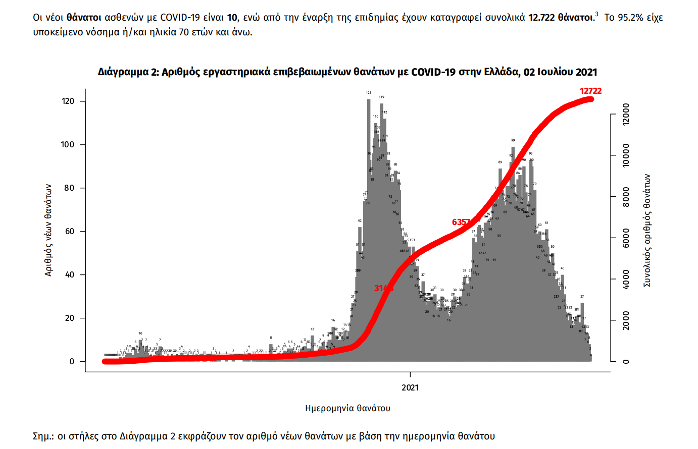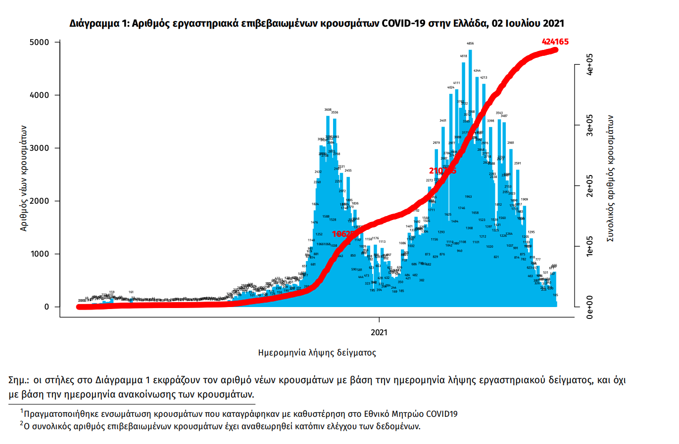 Τα στοιχεία που παρουσιάζονται αφορούν περιστατικά από την επιδημιολογική επιτήρηση της νόσου από το νέο κορωνοϊό (COVID19), με βάση τα δεδομένα που έχουν δηλωθεί στον ΕΟΔΥ και καταγραφεί μέχρι τις 02 Ιουλίου 2021 (ώρα 15:00). Τα νέα εργαστηριακά επιβεβαιωμένα κρούσματα της νόσου που καταγράφηκαν τις τελευταίες 24 ώρες είναι 771, εκ των οποίων 4 εντοπίστηκαν κατόπιν ελέγχων στις πύλες εισόδου της χώρας.