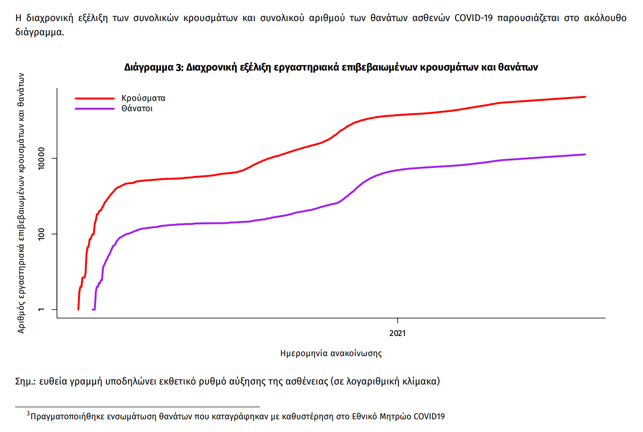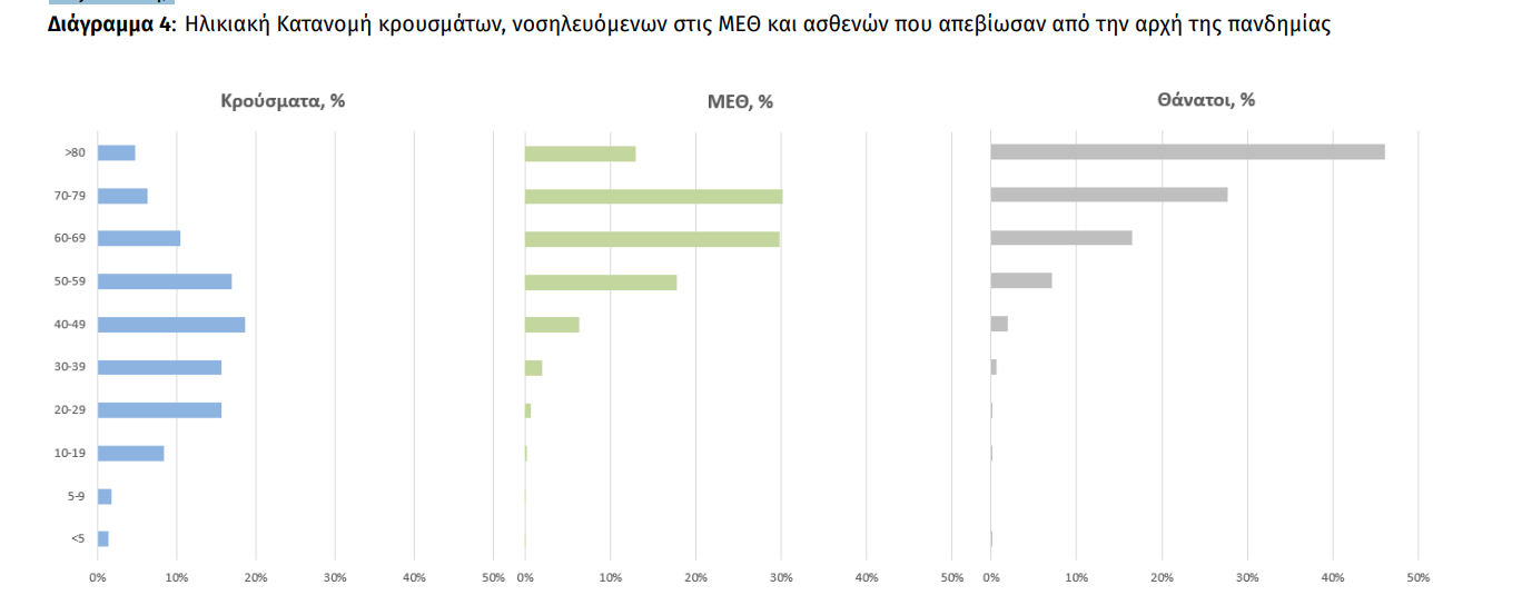 Ο αριθμός των ασθενών που νοσηλεύονται διασωληνωμένοι είναι 186 (66.7% άνδρες). Η διάμεση ηλικία τους είναι 66 έτη. To 84.4% έχει υποκείμενο νόσημα ή/και ηλικία 70 ετών και άνω. Από την αρχή της πανδημίας έχουν εξέλθει από τις ΜΕΘ 2.689 ασθενείς. Οι εισαγωγές4 νέων ασθενών Covid-19 στα νοσοκομεία της επικράτειας είναι 33 (ημερήσια μεταβολή -13.16%). Ο μέσος όρος εισαγωγών του επταημέρου είναι 38 ασθενείς.Η διάμεση ηλικία των κρουσμάτων είναι 43 έτη (εύρος 0.2 έως 106 έτη), ενώ η διάμεση ηλικία των θανόντων είναι 78 έτη (εύρος 0.2 έως 106 έτη).