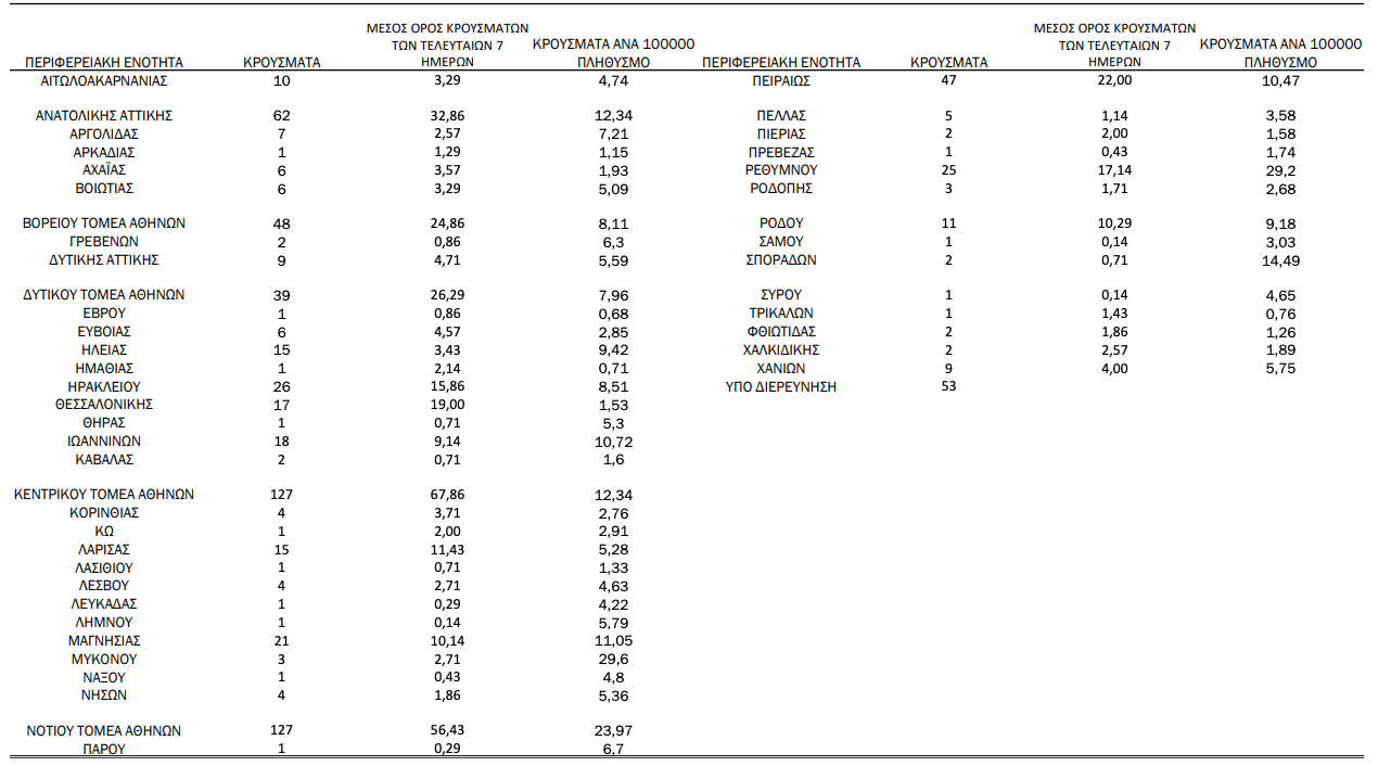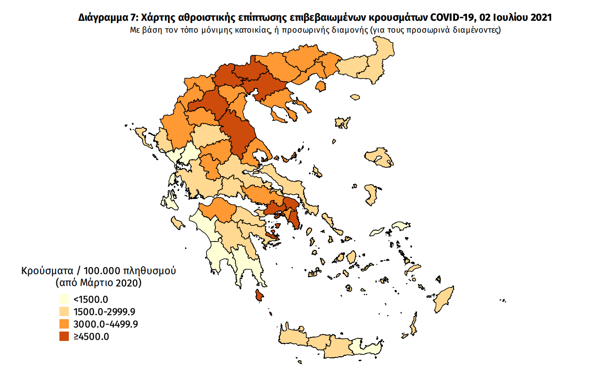 Γεωγραφική διασπορά: Ο χάρτης αποτυπώνει τη γεωγραφική κατανομή των συνολικών κρουσμάτων COVID-19 (από την αρχή της επιδημίας) ανά Περιφερειακή Ενότητα της χώρας, με βάση την δηλωθείσα διεύθυνση μόνιμης κατοικίας του ασθενούς, ή τη διεύθυνση προσωρινής διαμονής για τους τουρίστες και άλλους προσωρινά διαμένοντες στην Ελλάδα. Συμπεριλαμβάνονται τόσο κρούσματα με ιστορικό ταξιδίου (“εισαγόμενα”) όσο και κρούσματα με πιθανή εγχώρια μετάδοση.