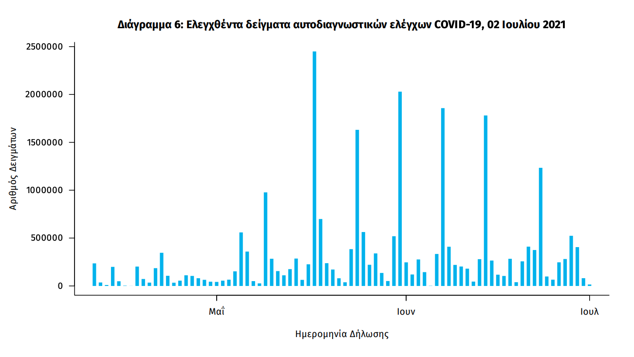Δείγματα που έχουν ελεγχθεί: Από την 1η Ιανουαρίου 2020 μέχρι σήμερα, στα εργαστήρια που διενεργούν ελέγχους για τον νέο κορωνοϊό (SARS-CoV-2) και που δηλώνουν συστηματικά το σύνολο των δειγμάτων που ελέγχουν, έχουν συνολικά ελεγχθεί 5.439.032 κλινικά δείγματα ενώ από Μονάδες Υγείας και Κλιμάκια του ΕΟΔΥ που διενεργούν ελέγχους Rapid Ag έχουν ελεγχθεί 5.275.114 δείγματα. O μέσος όρος του επταημέρου είναι 35.138 δειγματοληπτικοί έλεγχοι. Αυτοδιαγνωστικοί έλεγχοι (Self-tests): Έως 01 Ιουλίου 2021, έχουν καταγραφεί ηλεκτρονικά 26.003.097 δηλώσεις αποτελέσματος αυτοδιαγνωστικού ελέγχου, ενώ 486.306 άτομα προσήλθαν για επανέλεγχο. Mαζικές Δειγματοληψίες ΕΟΔΥ: Στις 01 Ιουλίου 2021, πραγματοποιήθηκαν 131 δράσεις δειγματοληπτικών ελέγχων από τις Κινητές Ομάδες Υγείας (ΚΟΜΥ) του ΕΟΔΥ, στις οποίες διενεργήθηκαν 6.838 έλεγχοι Rapid Ag και ανευρέθηκαν 104 θετικά (1,52%).