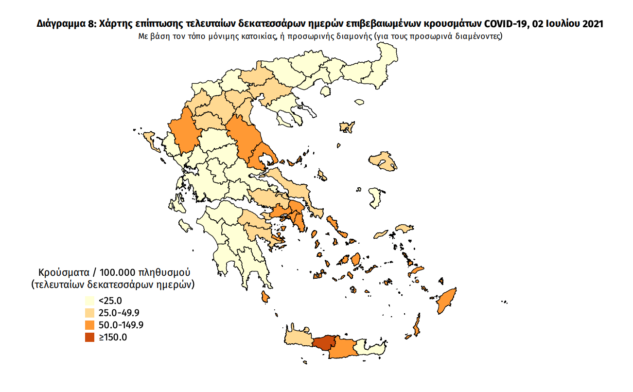 Κατανομή ανακοινωθέντων εγχώριων κρουσμάτων: Από το σύνολο των 771 νέων κρουσμάτων του νέου ιού στη χώρα 18 είναι εισαγόμενα εκ των οποίων 4 εντοπίστηκαν κατόπιν ελέγχων στις πύλες εισόδου της χώρας. Η κατανομή των 753 νέων εγχώριων κρουσμάτων ανά Περιφερειακή Ενότητα παρουσιάζεται στον κατωτέρω πίνακα.5 Πίνακας 2: Ημερήσιος αριθμός και κρούσματα ανά 100.000 πληθυσμού επιβεβαιωμένων εγχώριων κρουσμάτων COVID-19 ανά περιφερειακή ενότητα στις 02 Ιουλίου 2021