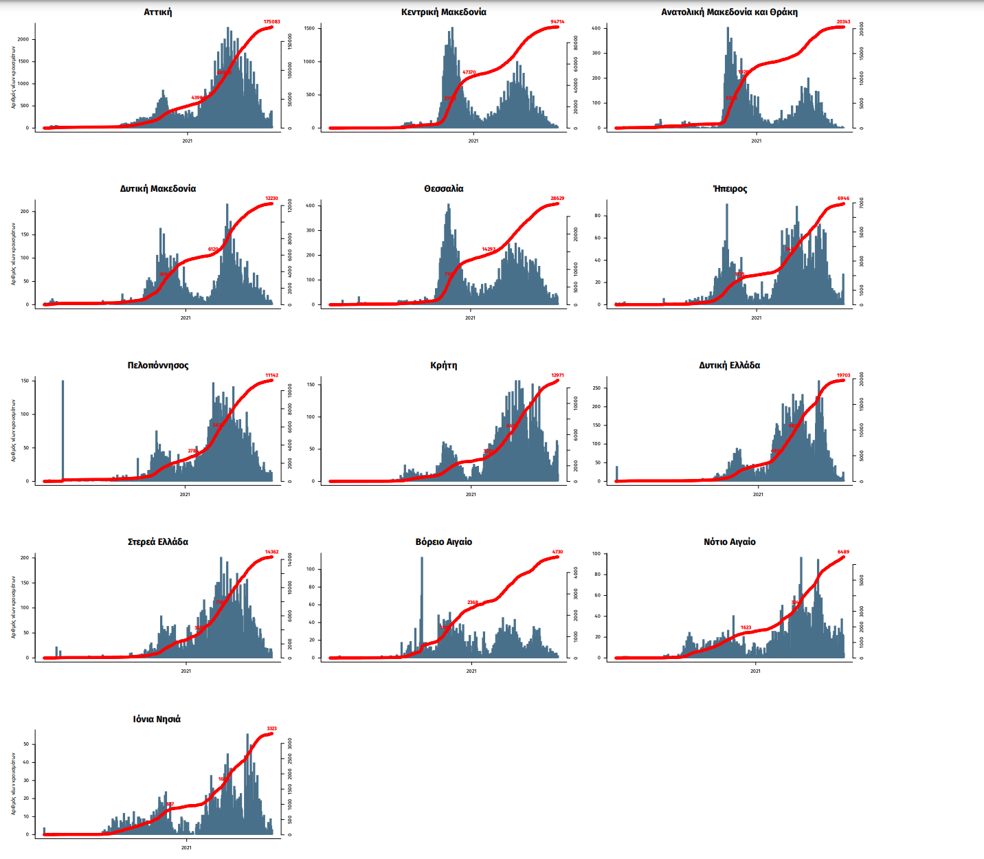 Παράρτημα 1: Επιδημικές καμπύλες κρουσμάτων COVID-19 με βάση την δηλωθείσα διεύθυνση μόνιμης κατοικίας του κρούσματος ή τη διεύθυνση προσωρινής διαμονής για τους τουρίστες και άλλους προσωρινά διαμένοντες στην Ελλάδα. Συμπεριλαμβάνονται τόσο κρούσματα με ιστορικό ταξιδίου όσο και κρούσματα με πιθανή εγχώρια μετάδοση.