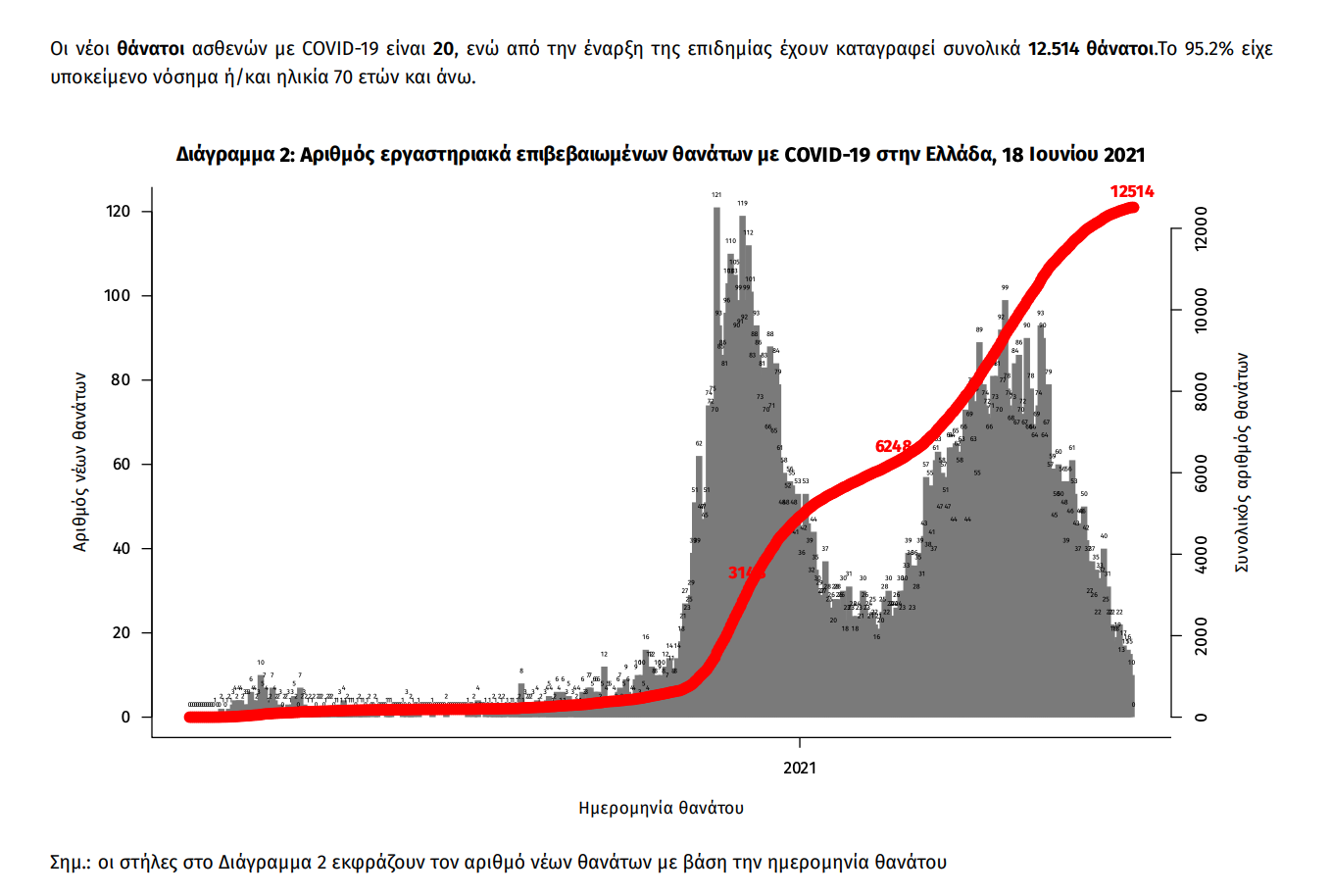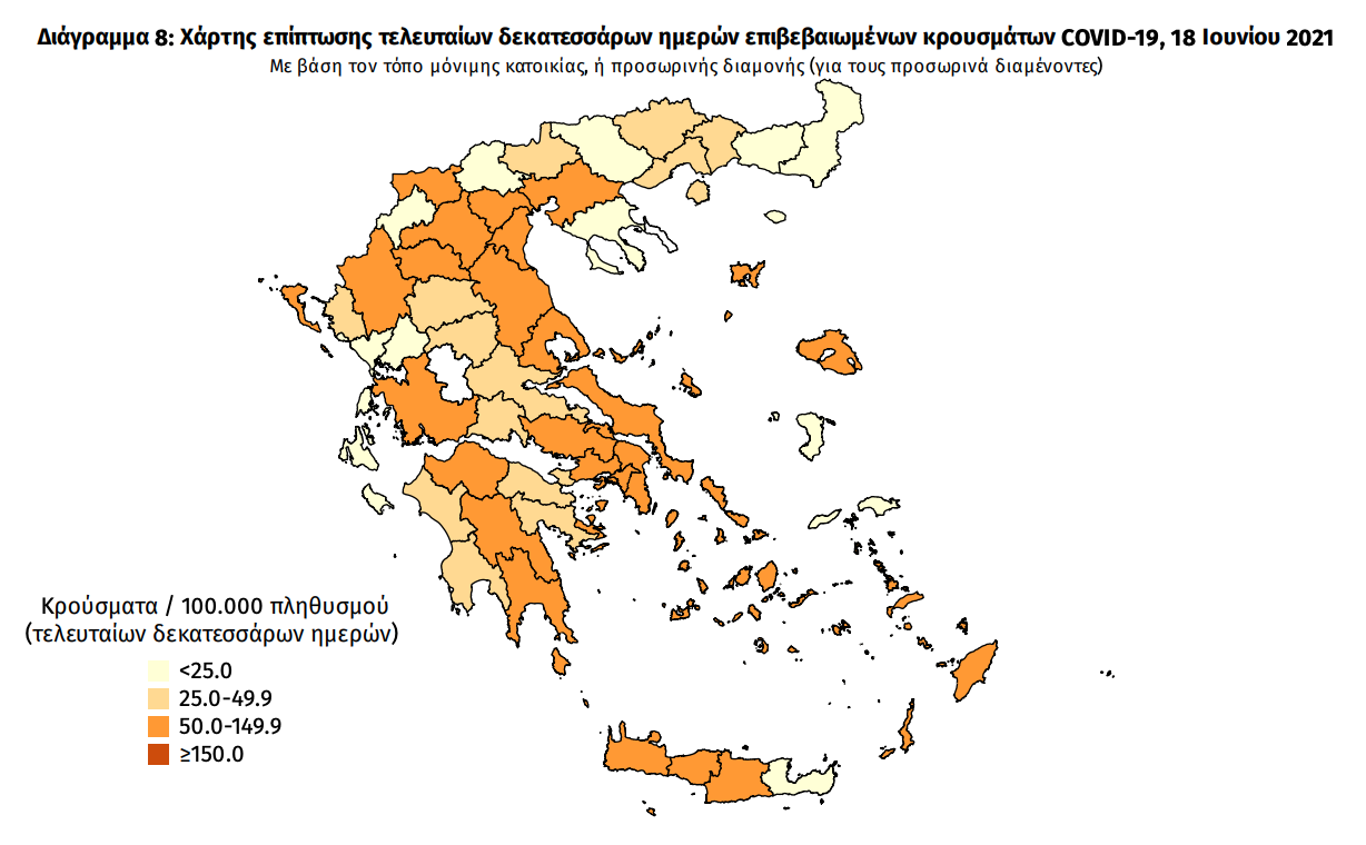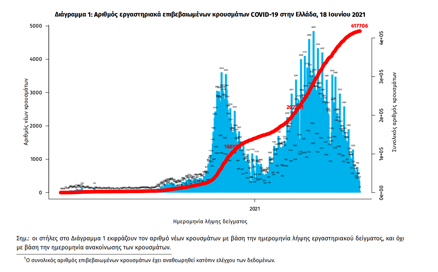 Τα στοιχεία που παρουσιάζονται αφορούν περιστατικά από την επιδημιολογική επιτήρηση της νόσου από το νέο κορωνοϊό (COVID19), με βάση τα δεδομένα που έχουν δηλωθεί στον ΕΟΔΥ και καταγραφεί μέχρι τις 18 Ιουνίου 2021 (ώρα 15:00). Τα νέα εργαστηριακά επιβεβαιωμένα κρούσματα της νόσου που καταγράφηκαν τις τελευταίες 24 ώρες είναι 469, εκ των οποίων 2 εντοπίστηκαν κατόπιν ελέγχων στις πύλες εισόδου της χώρας.