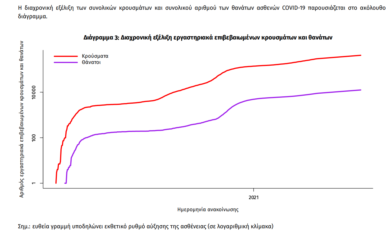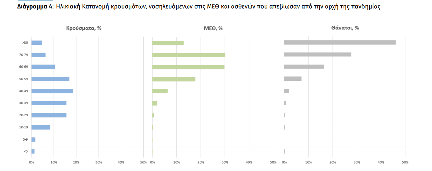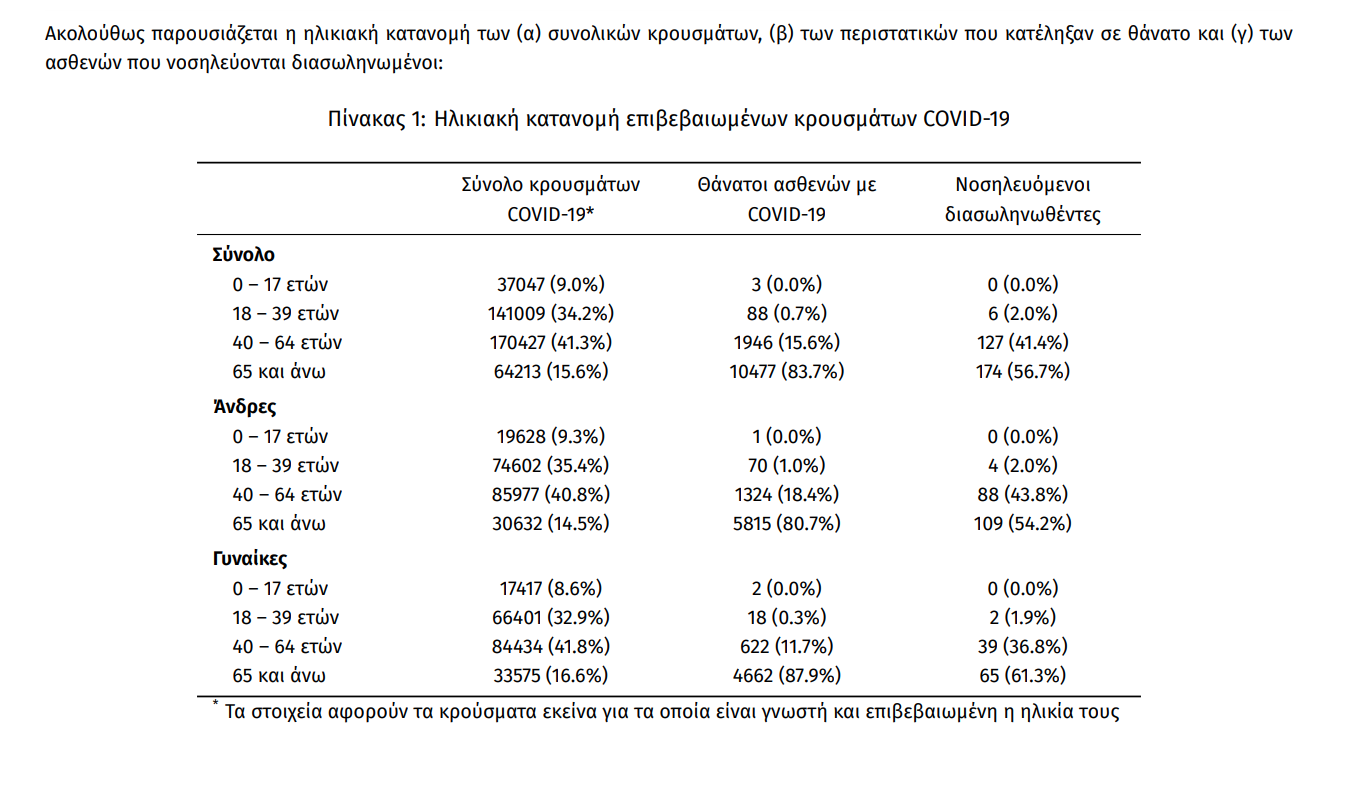 Ο αριθμός των ασθενών που νοσηλεύονται διασωληνωμένοι είναι 307 (65.5% άνδρες). Η διάμεση ηλικία τους είναι 67 έτη. To 85.0% έχει υποκείμενο νόσημα ή/και ηλικία 70 ετών και άνω. Από την αρχή της πανδημίας έχουν εξέλθει από τις ΜΕΘ 2.602 ασθενείς. Οι εισαγωγές2 νέων ασθενών Covid-19 στα νοσοκομεία της επικράτειας είναι 63 (ημερήσια μεταβολή +3.28%). Ο μέσος όρος εισαγωγών του επταημέρου είναι 81 ασθενείς.Η διάμεση ηλικία των κρουσμάτων είναι 43 έτη (εύρος 0.2 έως 106 έτη), ενώ η διάμεση ηλικία των θανόντων είναι 78 έτη (εύρος 0.2 έως 106 έτη).