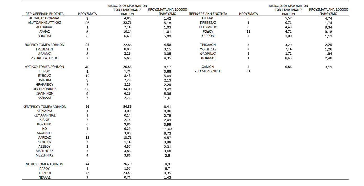 Κατανομή ανακοινωθέντων εγχώριων κρουσμάτων: Από το σύνολο των 469 νέων κρουσμάτων του νέου ιού στη χώρα 3 είναι εισαγόμενα εκ των οποίων 2 εντοπίστηκαν κατόπιν ελέγχων στις πύλες εισόδου της χώρας Η κατανομή των 466 νέων εγχώριων κρουσμάτων ανά Περιφερειακή Ενότητα παρουσιάζεται στον κατωτέρω πίνακα.3 Πίνακας 2: Ημερήσιος αριθμός και κρούσματα ανά 100.000 πληθυσμού επιβεβαιωμένων εγχώριων κρουσμάτων COVID-19 ανά περιφερειακή ενότητα στις 18 Ιουνίου 2021