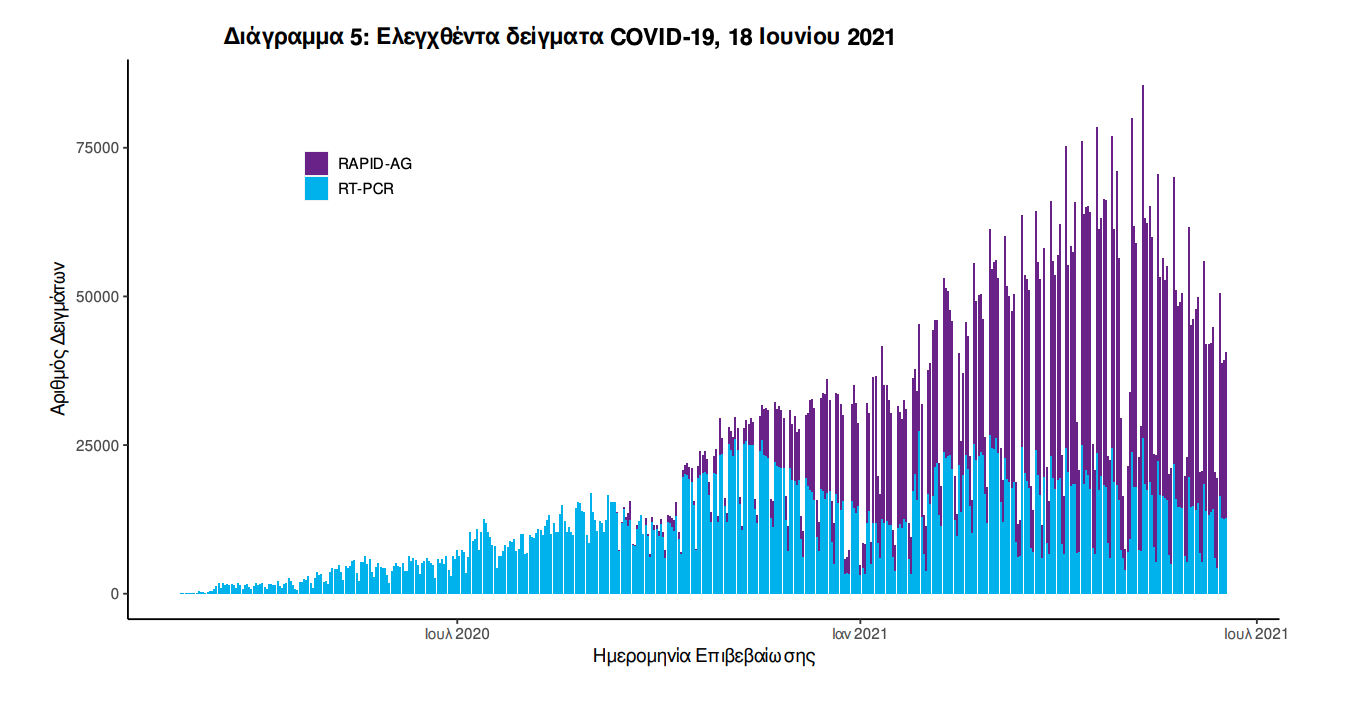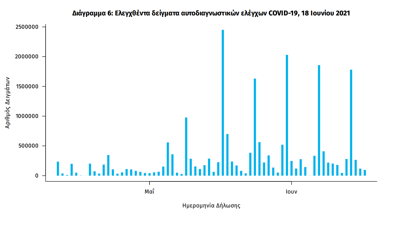 Δείγματα που έχουν ελεγχθεί: Από την 1η Ιανουαρίου 2020 μέχρι σήμερα, στα εργαστήρια που διενεργούν ελέγχους για τον νέο κορωνοϊό (SARS-CoV-2) και που δηλώνουν συστηματικά το σύνολο των δειγμάτων που ελέγχουν, έχουν συνολικά ελεγχθεί 5.297.884 κλινικά δείγματα ενώ από Μονάδες Υγείας και Κλιμάκια του ΕΟΔΥ που διενεργούν ελέγχους Rapid Ag έχουν ελεγχθεί 4.950.411 δείγματα. O μέσος όρος του επταημέρου είναι 36.282 δειγματοληπτικοί έλεγχοι. Αυτοδιαγνωστικοί έλεγχοι (Self-tests): Έως 17 Ιουνίου 2021, έχουν καταγραφεί ηλεκτρονικά 21.681.161 δηλώσεις αποτελέσματος αυτοδιαγνωστικού ελέγχου, ενώ 408.013 άτομα προσήλθαν για επανέλεγχο. Mαζικές Δειγματοληψίες ΕΟΔΥ: Στις 17 Ιουνίου 2021, πραγματοποιήθηκαν 140 δράσεις δειγματοληπτικών ελέγχων από τις Κινητές Ομάδες Υγείας (ΚΟΜΥ) του ΕΟΔΥ, στις οποίες διενεργήθηκαν 9.171 έλεγχοι Rapid Ag και ανευρέθηκαν 63 θετικά (0,69%).