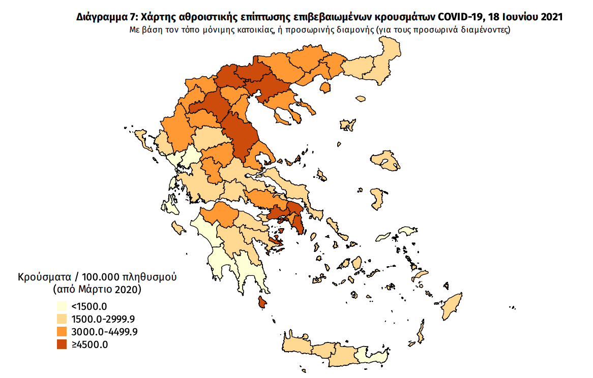Γεωγραφική διασπορά: Ο χάρτης αποτυπώνει τη γεωγραφική κατανομή των συνολικών κρουσμάτων COVID-19 (από την αρχή της επιδημίας) ανά Περιφερειακή Ενότητα της χώρας, με βάση την δηλωθείσα διεύθυνση μόνιμης κατοικίας του ασθενούς, ή τη διεύθυνση προσωρινής διαμονής για τους τουρίστες και άλλους προσωρινά διαμένοντες στην Ελλάδα. Συμπεριλαμβάνονται τόσο κρούσματα με ιστορικό ταξιδίου (“εισαγόμενα”) όσο και κρούσματα με πιθανή εγχώρια μετάδοση.