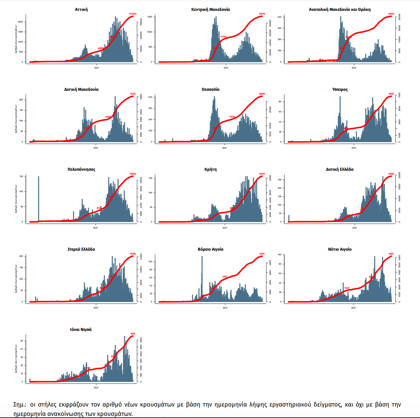 Παράρτημα 1: Επιδημικές καμπύλες κρουσμάτων COVID-19 με βάση την δηλωθείσα διεύθυνση μόνιμης κατοικίας του κρούσματος ή τη διεύθυνση προσωρινής διαμονής για τους τουρίστες και άλλους προσωρινά διαμένοντες στην Ελλάδα. Συμπεριλαμβάνονται τόσο κρούσματα με ιστορικό ταξιδίου όσο και κρούσματα με πιθανή εγχώρια μετάδοση.