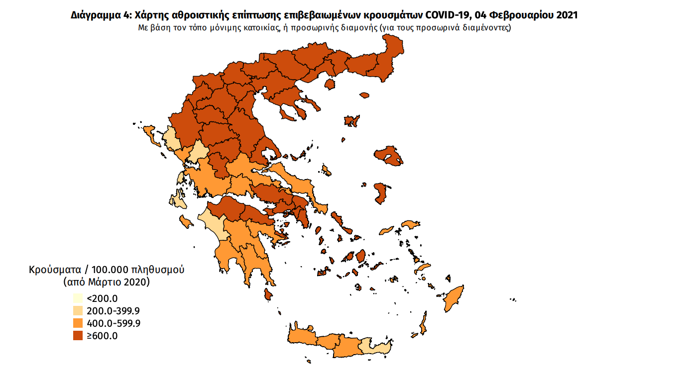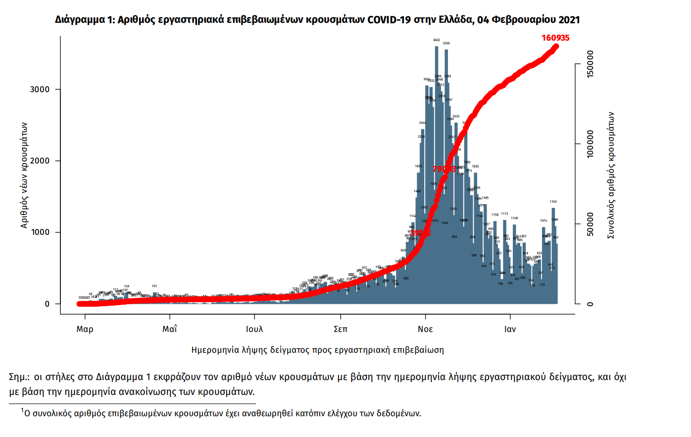 Τα στοιχεία που παρουσιάζονται αφορούν περιστατικά από την επιδημιολογική επιτήρηση της νόσου από το νέο κορωνοϊό (COVID19), με βάση τα δεδομένα που έχουν δηλωθεί στον ΕΟΔΥ και καταγραφεί μέχρι τις 04 Φεβρουαρίου 2021 (ώρα 15:00). Τα νέα εργαστηριακά επιβεβαιωμένα κρούσματα της νόσου είναι 1070, εκ των οποίων 1 εντοπίστηκε κατόπιν ελέγχων στις πύλες εισόδου της χώρας.