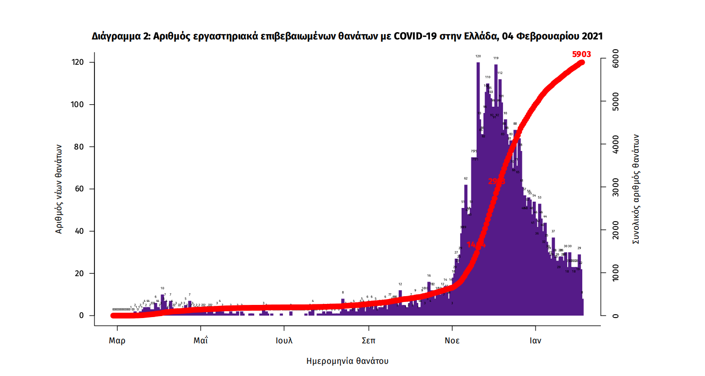Τέλος, έχουμε 25 νέους θανάτους από τη νόσο COVID-19, φθάνοντας τους 5903 θανάτους συνολικά στη χώρα, εκ των οποίων 3473 (58.8%) άνδρες. Η διάμεση ηλικία των θανόντων συμπολιτών μας ήταν τα 79 έτη και το 95.6% είχε κάποιο υποκείμενο νόσημα ή/και ηλικία 70 ετών και άνω.