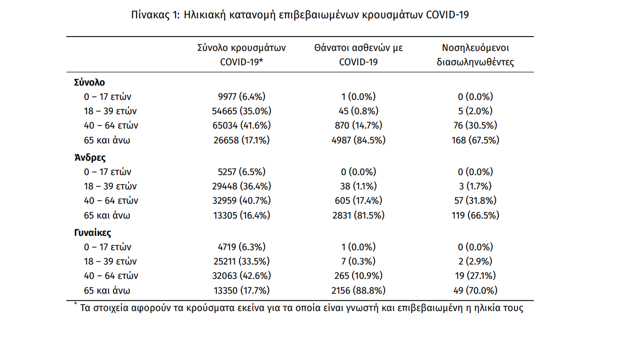 Η διάμεση ηλικία των κρουσμάτων είναι 44 έτη (εύρος 0.2 έως 105 έτη), ενώ η διάμεση ηλικία των θανάτων είναι 79 έτη (εύρος 15 έως 103 έτη). Η ηλικιακή κατανομή των (α) συνολικών κρουσμάτων, (β) των περιστατικών που κατέληξαν σε θάνατο και (γ) των ασθενών που νοσηλεύονται διασωληνωμένοι, είναι η ακόλουθη: