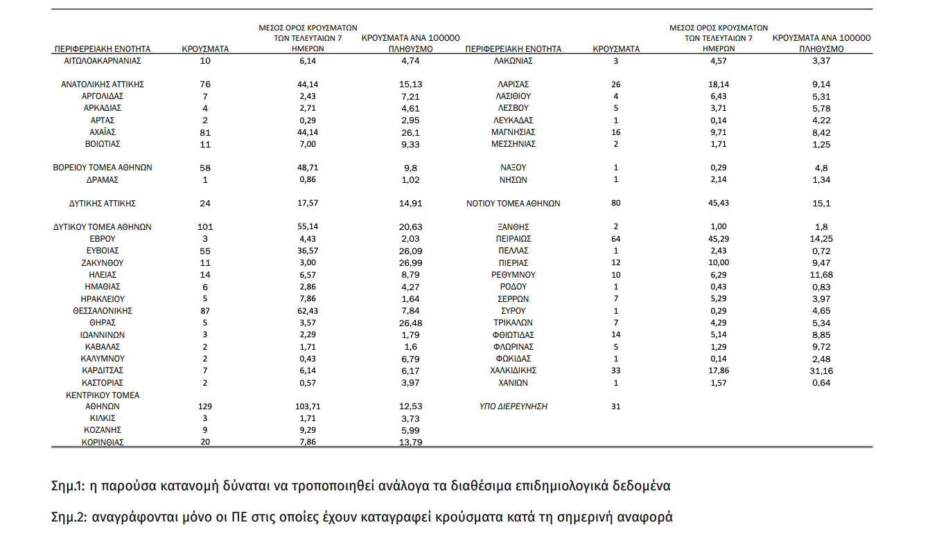 Γεωγραφική διασπορά Ο χάρτης αποτυπώνει τη γεωγραφική κατανομή των συνολικών κρουσμάτων COVID-19 (από την αρχή της επιδημίας) ανά Περιφερειακή Ενότητα της χώρας, με βάση την δηλωθείσα διεύθυνση μόνιμης κατοικίας του ασθενούς, ή τη διεύθυνση προσωρινής διαμονής για τους τουρίστες και άλλους προσωρινά διαμένοντες στην Ελλάδα. Συμπεριλαμβάνονται τόσο κρούσματα με ιστορικό ταξιδίου (“εισαγόμενα”) όσο και κρούσματα με πιθανή εγχώρια μετάδοση