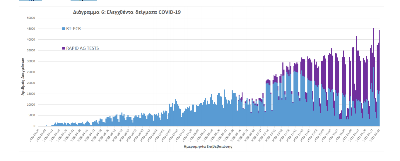 Δείγματα που έχουν ελεγχθεί: Από την 1η Ιανουαρίου 2020 μέχρι σήμερα, στα εργαστήρια που διενεργούν ελέγχους για τον νέο κορωνοϊό (SARS-CoV-2) και που δηλώνουν συστηματικά στον ΕΟΔΥ το σύνολο των δειγμάτων που ελέγχουν, έχουν συνολικά ελεγχθεί 3.185.847 κλινικά δείγματα ενώ από Μονάδες Υγείας και Κλιμάκια του ΕΟΔΥ που διενεργούν ελέγχους Rapid Ag έχουν ελεγχθεί 1.127.502 δείγματα.
