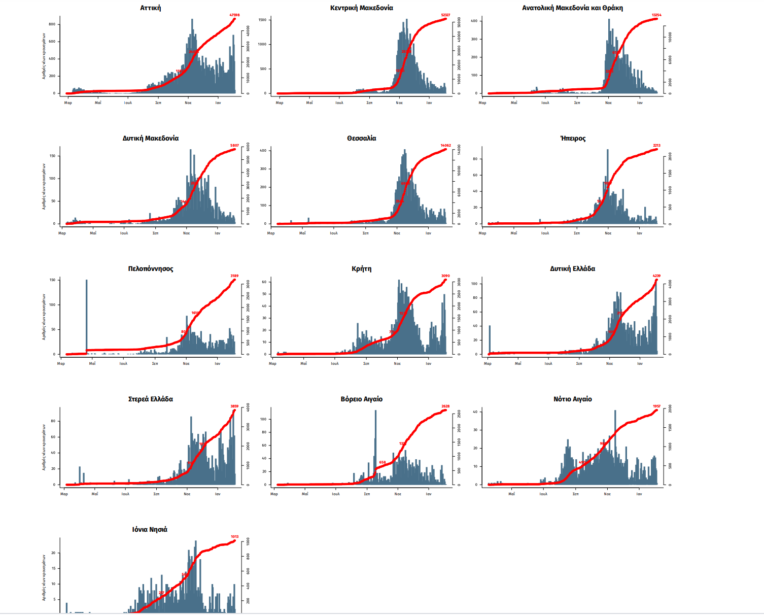 Παράρτημα 1: Επιδημικές καμπύλες κρουσμάτων COVID-19 με βάση την δηλωθείσα διεύθυνση μόνιμης κατοικίας του κρούσματος ή τη διεύθυνση προσωρινής διαμονής για τους τουρίστες και άλλους προσωρινά διαμένοντες στην Ελλάδα. Συμπεριλαμβάνονται τόσο κρούσματα με ιστορικό ταξιδίου όσο και κρούσματα με πιθανή εγχώρια μετάδοση.