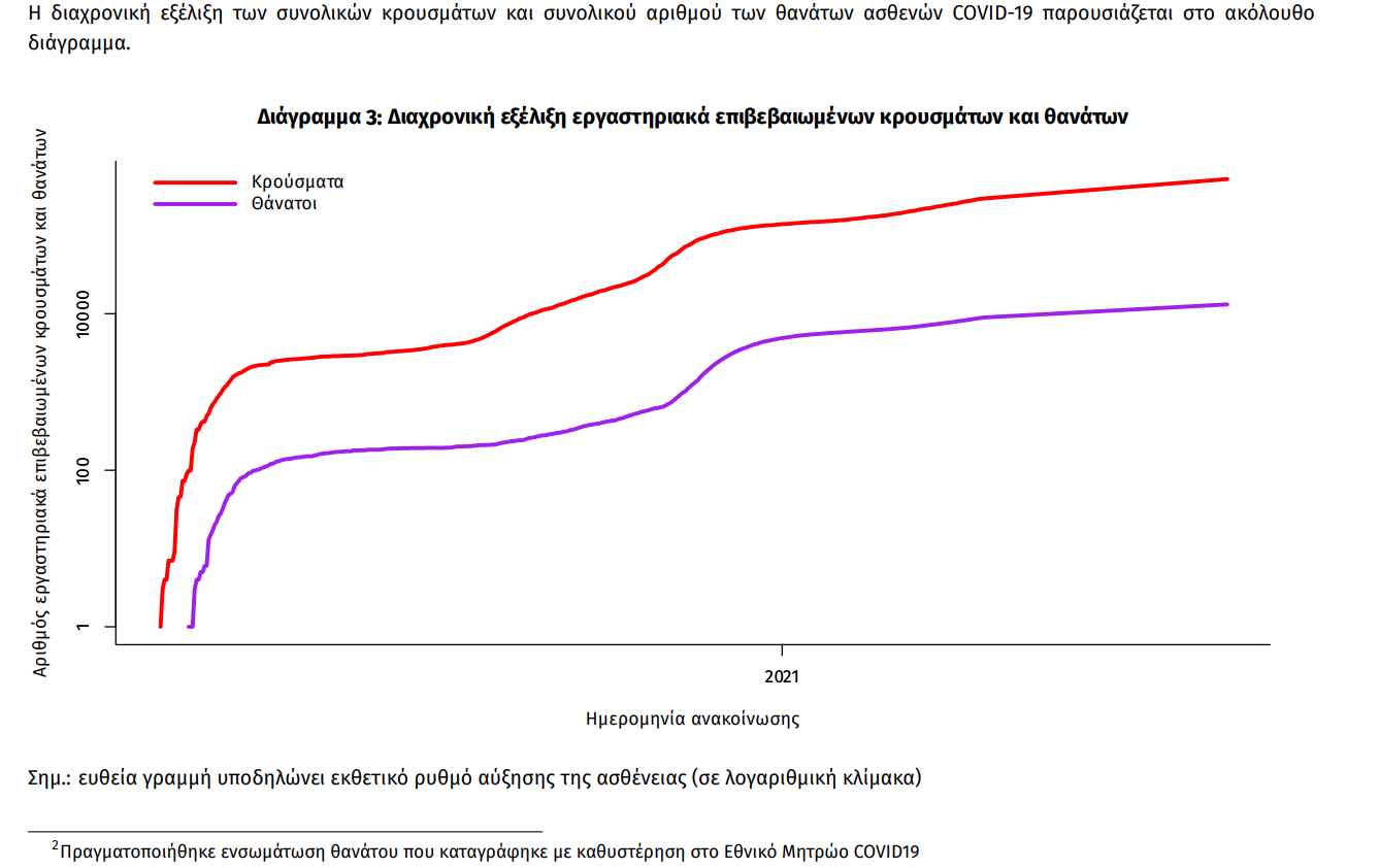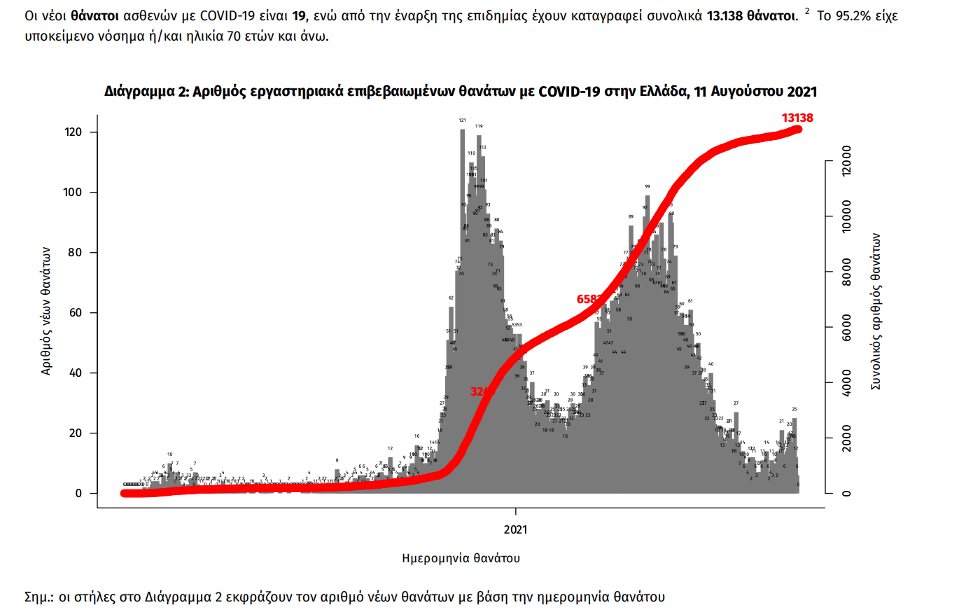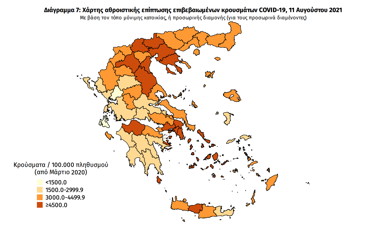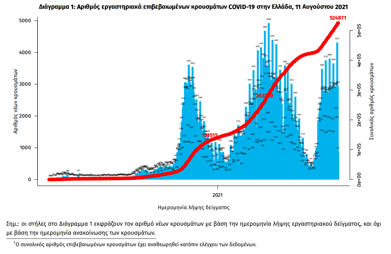 Τα στοιχεία που παρουσιάζονται αφορούν περιστατικά από την επιδημιολογική επιτήρηση της νόσου από το νέο κορωνοϊό (COVID19), με βάση τα δεδομένα που έχουν δηλωθεί στον ΕΟΔΥ και καταγραφεί μέχρι τις 11 Αυγούστου 2021 (ώρα 15:00). Τα νέα εργαστηριακά επιβεβαιωμένα κρούσματα της νόσου που καταγράφηκαν τις τελευταίες 24 ώρες είναι 3.475, εκ των οποίων 15 εντοπίστηκαν κατόπιν ελέγχων στις πύλες εισόδου της χώρας. Ο συνολικός αριθμός των κρουσμάτων ανέρχεται σε 524.871 (ημερήσια μεταβολή +0.7%), εκ των οποίων 51.2% άνδρες. 1 Με βάση τα επιβεβαιωμένα κρούσματα των τελευταίων 7 ημερών, 128 θεωρούνται σχετιζόμενα με ταξίδι από το εξωτερικό και 2.564 είναι σχετιζόμενα με ήδη γνωστό κρούσμα. To για την επικράτεια βάσει των κρουσμάτων εκτιμάται σε 1.09 (95% ΔΕ: 0.88 – 1.37) Ημερήσια εξέλιξη της πανδημίας: Η ημερήσια κατανομή των επιβεβαιωμένων κρουσμάτων είναι η ακόλουθη (η γραμμή παριστάνει την συνολική, αθροιστική κατανομή των κρουσμάτων).