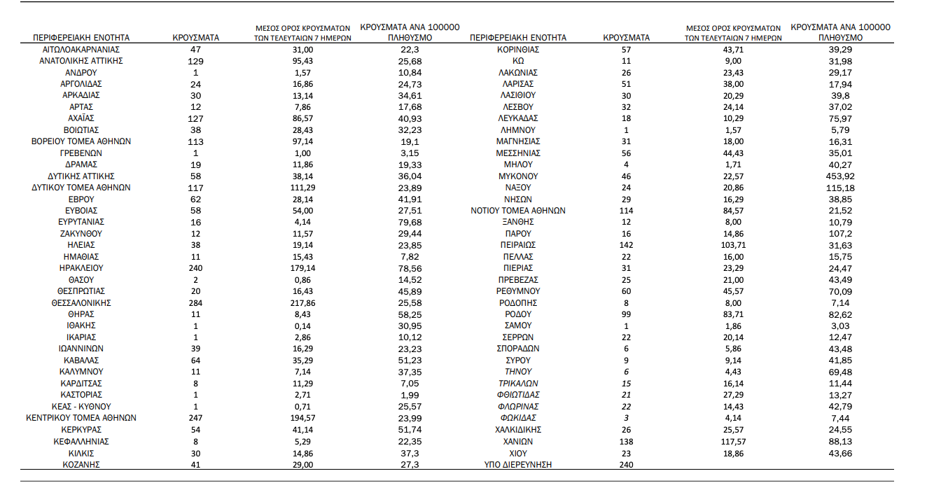Κατανομή ανακοινωθέντων εγχώριων κρουσμάτων: Από το σύνολο των 3.475 νέων κρουσμάτων του νέου ιού στη χώρα 22 είναι εισαγόμενα εκ των οποίων 15 εντοπίστηκαν κατόπιν ελέγχων στις πύλες εισόδου της χώρας . Η κατανομή των 3.453 νέων εγχώριων κρουσμάτων ανά Περιφερειακή Ενότητα παρουσιάζεται στον κατωτέρω πίνακα.4 Πίνακας 2: Ημερήσιος αριθμός και κρούσματα ανά 100.000 πληθυσμού επιβεβαιωμένων εγχώριων κρουσμάτων COVID-19 ανά περιφερειακή ενότητα στις 11 Αυγούστου 2021. 5