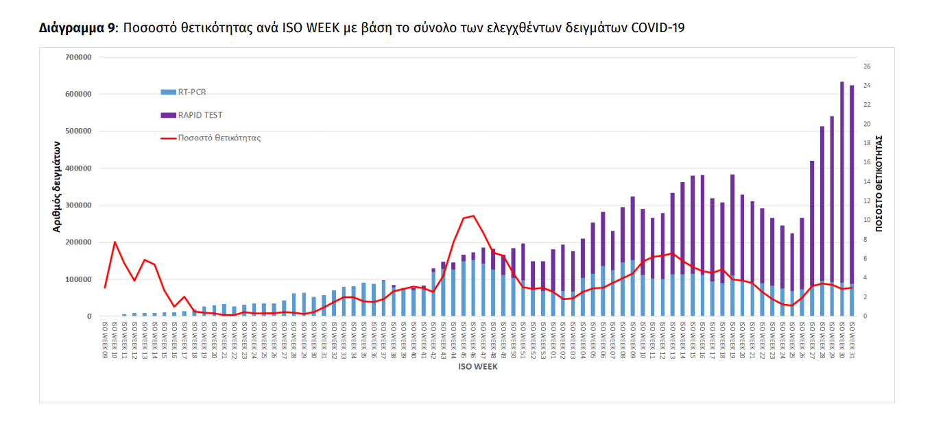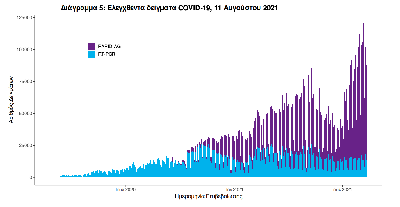 Δείγματα που έχουν ελεγχθεί: Από την 1η Ιανουαρίου 2020 μέχρι σήμερα, στα εργαστήρια που διενεργούν ελέγχους για τον νέο κορωνοϊό (SARS-CoV-2) και που δηλώνουν συστηματικά το σύνολο των δειγμάτων που ελέγχουν, έχουν συνολικά ελεγχθεί 5.943.256 κλινικά δείγματα ενώ από Μονάδες Υγείας και Κλιμάκια του ΕΟΔΥ που διενεργούν ελέγχους Rapid Ag έχουν ελεγχθεί 7.792.616 δείγματα. O μέσος όρος του επταημέρου είναι 88.970 δειγματοληπτικοί έλεγχοι. Αυτοδιαγνωστικοί έλεγχοι (Self-tests): Έως 10 Αυγούστου 2021, έχουν καταγραφεί ηλεκτρονικά 31.357.757 δηλώσεις αποτελέσματος αυτοδιαγνωστικού ελέγχου. Από τα 941.447 άτομα που προσήλθαν για επανέλεγχο, έχουν καταγραφεί 73.465 θετικά αποτελέσματα. Mαζικές Δειγματοληψίες ΕΟΔΥ: Στις 10 Αυγούστου 2021, πραγματοποιήθηκαν 141 δράσεις δειγματοληπτικών ελέγχων από τις Κινητές Ομάδες Υγείας (ΚΟΜΥ) του ΕΟΔΥ, στις οποίες διενεργήθηκαν 25.619 έλεγχοι Rapid Ag και ανευρέθηκαν 709 θετικά (2,77%)