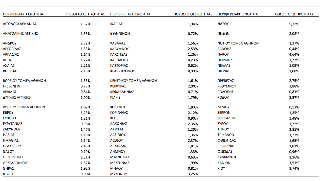 Συγκεντρωτικά στοιχεία της εβδομάδας 02 Αυγούστου 2021 – 08 Αυγούστου 2021 (2021-W31) Την εβδομάδα 02 Αυγούστου 2021 – 08 Αυγούστου 2021 (2021-W31) το ποσοστό θετικότητας ήταν 3.05% σε σύνολο 623.985 εργαστηριακών ελέγχων (RT-PCR/Rapid-Ag) και 0.79% σε σύνολο 709.364 αυτοδιαγνωστικών ελέγχων. Στο σύνολο των ελέγχων, το ποσοστό θετικότητας ήταν 1.47%. Πίνακας 3: Ποσοστό θετικότητας στο σύνολο των ελέγχων ανά Περιφερειακή Ενότητα με δεδομένα από 02 Αυγούστου 2021 έως 08 Αυγούστου 2021 (2021-W31)