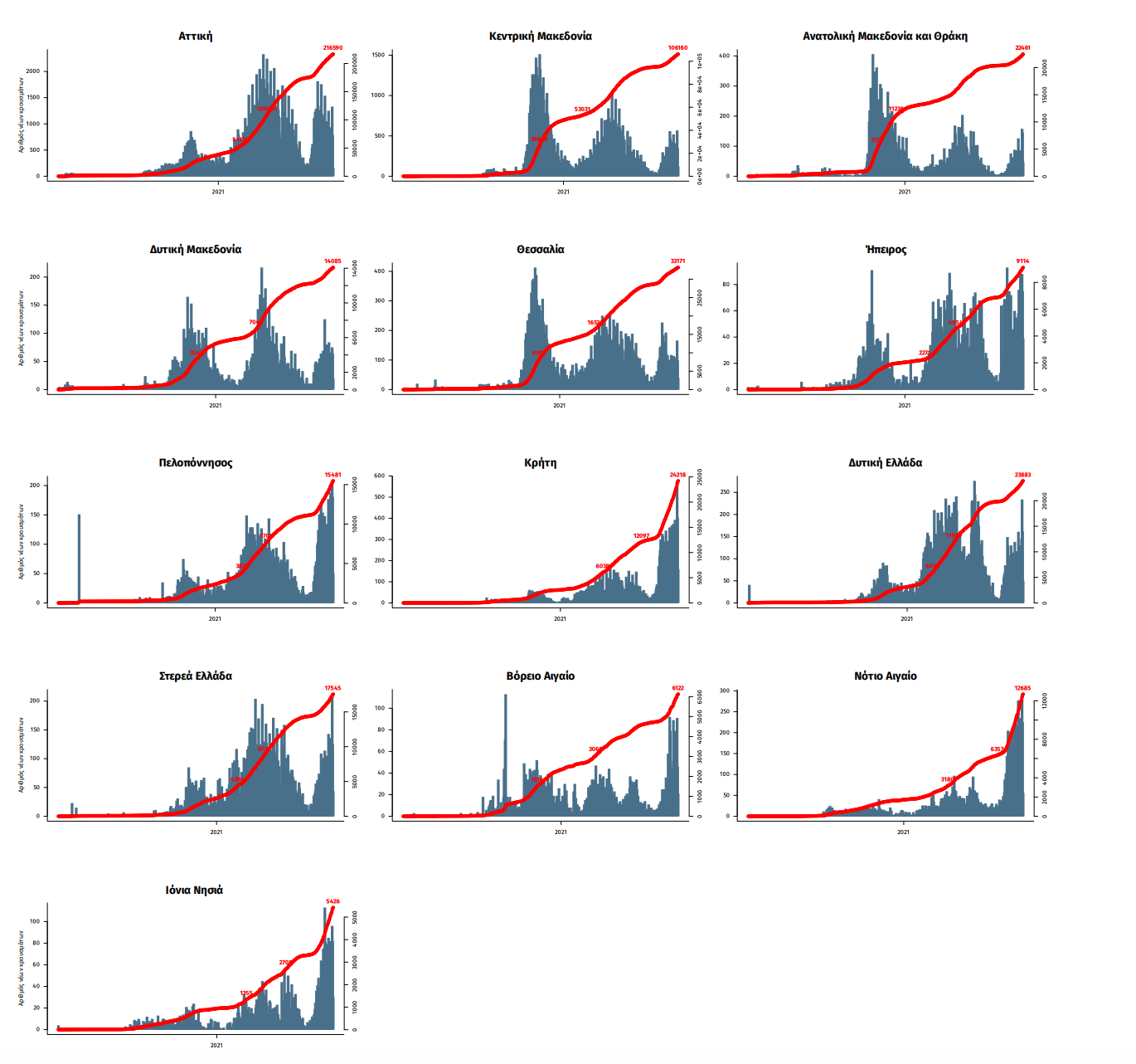 Παράρτημα 1: Επιδημικές καμπύλες κρουσμάτων COVID-19 με βάση την δηλωθείσα διεύθυνση μόνιμης κατοικίας του κρούσματος ή τη διεύθυνση προσωρινής διαμονής για τους τουρίστες και άλλους προσωρινά διαμένοντες στην Ελλάδα. Συμπεριλαμβάνονται τόσο κρούσματα με ιστορικό ταξιδίου όσο και κρούσματα με πιθανή εγχώρια μετάδοση.