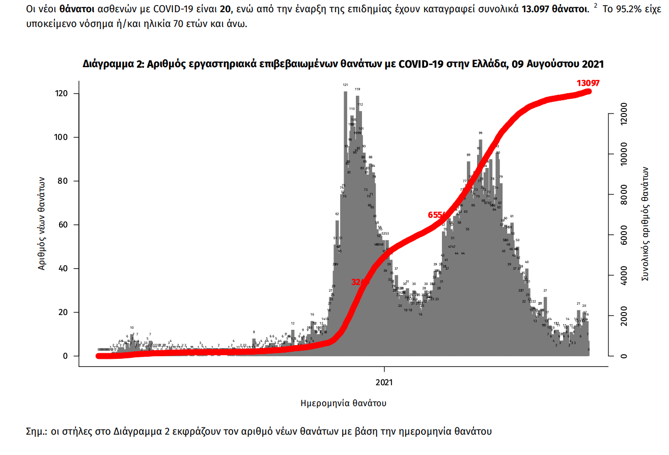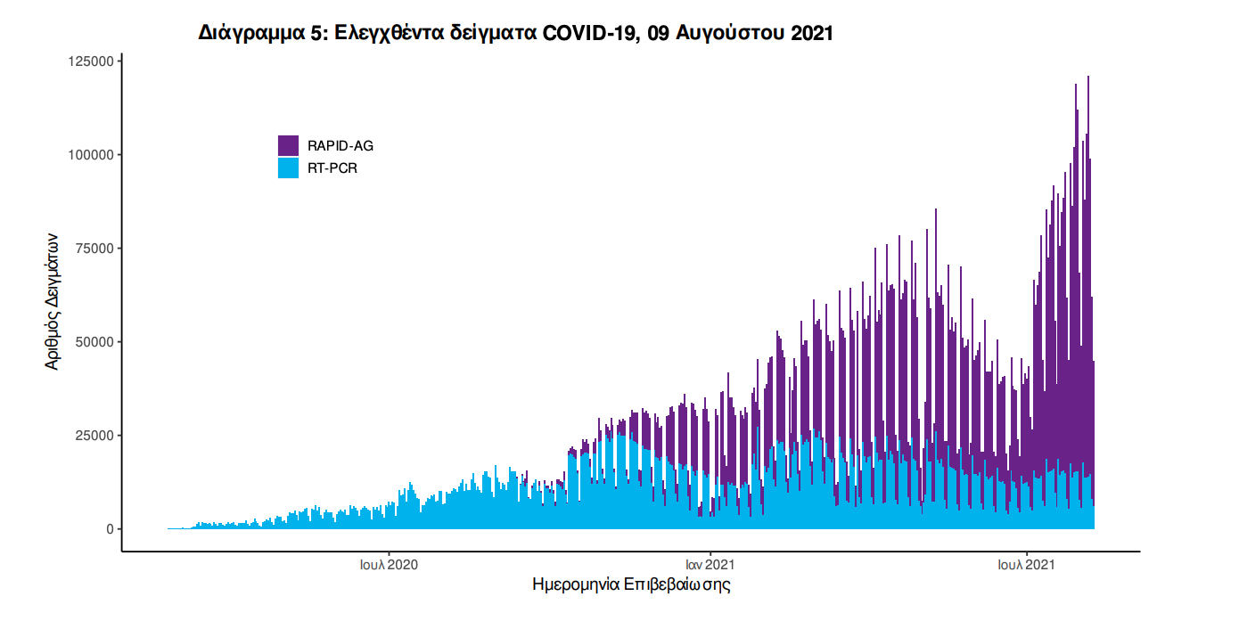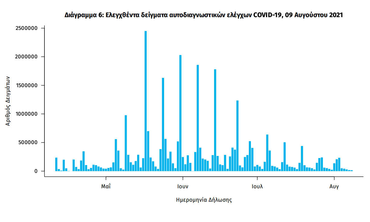 Δείγματα που έχουν ελεγχθεί: Από την 1η Ιανουαρίου 2020 μέχρι σήμερα, στα εργαστήρια που διενεργούν ελέγχους για τον νέο κορωνοϊό (SARS-CoV-2) και που δηλώνουν συστηματικά το σύνολο των δειγμάτων που ελέγχουν, έχουν συνολικά ελεγχθεί 5.911.547 κλινικά δείγματα ενώ από Μονάδες Υγείας και Κλιμάκια του ΕΟΔΥ που διενεργούν ελέγχους Rapid Ag έχουν ελεγχθεί 7.633.981 δείγματα. O μέσος όρος του επταημέρου είναι 89.141 δειγματοληπτικοί έλεγχοι. Αυτοδιαγνωστικοί έλεγχοι (Self-tests): Έως 08 Αυγούστου 2021, έχουν καταγραφεί ηλεκτρονικά 31.077.150 δηλώσεις αποτελέσματος αυτοδιαγνωστικού ελέγχου, ενώ 919.703 άτομα προσήλθαν για επανέλεγχο. Mαζικές Δειγματοληψίες ΕΟΔΥ: Στις 08 Αυγούστου 2021, πραγματοποιήθηκαν 39 δράσεις δειγματοληπτικών ελέγχων από τις Κινητές Ομάδες Υγείας (ΚΟΜΥ) του ΕΟΔΥ, στις οποίες διενεργήθηκαν 9.535 έλεγχοι Rapid Ag και ανευρέθηκαν 381 θετικά (4%).