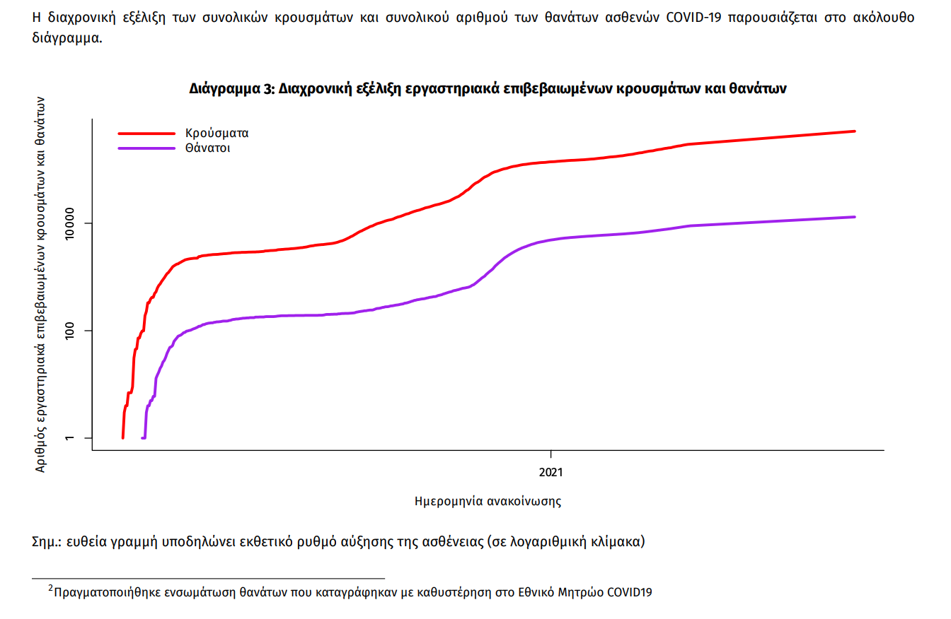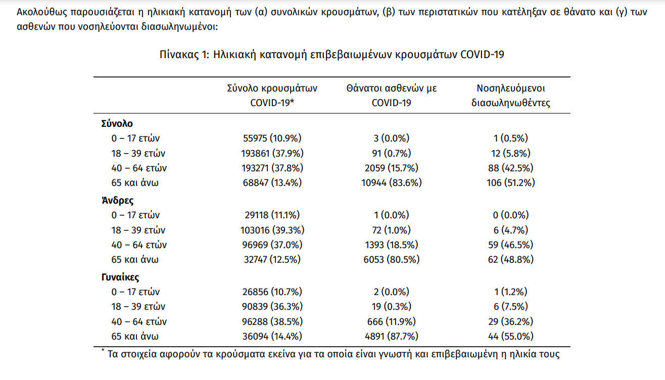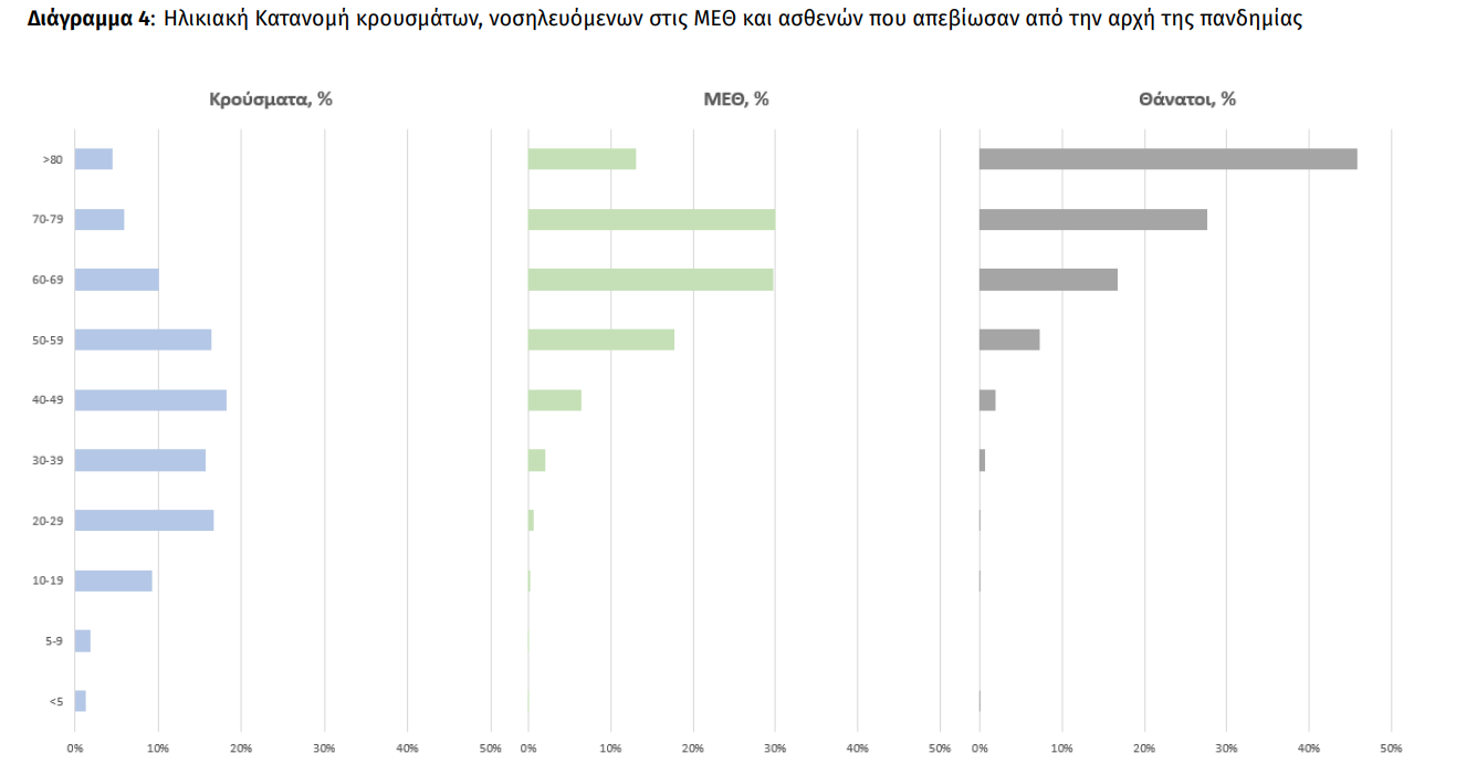 Ο αριθμός των ασθενών που νοσηλεύονται διασωληνωμένοι είναι 207 (61.4% άνδρες). Η διάμεση ηλικία τους είναι 65 έτη. To 83.6% έχει υποκείμενο νόσημα ή/και ηλικία 70 ετών και άνω. Από την αρχή της πανδημίας έχουν εξέλθει από τις ΜΕΘ 2.842 ασθενείς. Οι εισαγωγές3 νέων ασθενών Covid-19 στα νοσοκομεία της επικράτειας είναι 212 (ημερήσια μεταβολή +1.44%). Ο μέσος όρος εισαγωγών του επταημέρου είναι 197 ασθενείς.Η διάμεση ηλικία των κρουσμάτων είναι 40 έτη (εύρος 0.2 έως 106 έτη), ενώ η διάμεση ηλικία των θανόντων είναι 78 έτη (εύρος 0.2 έως 106 έτη).