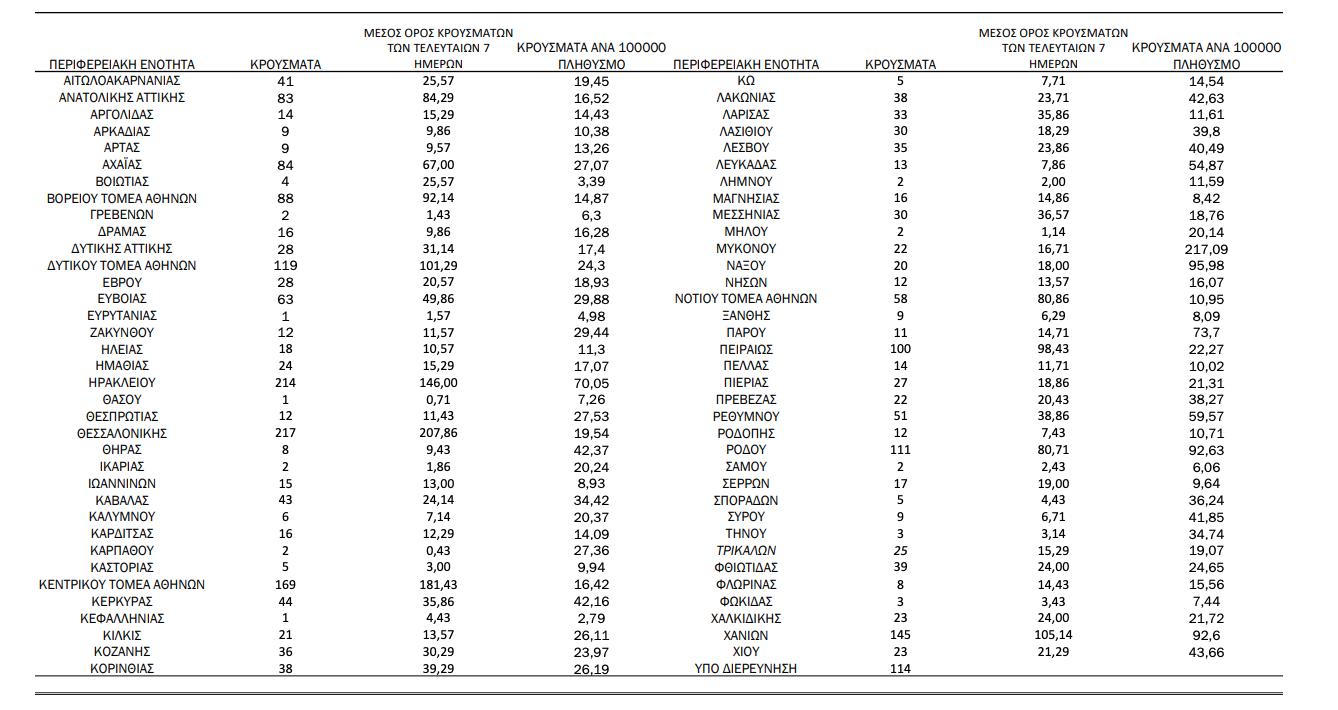 Κατανομή ανακοινωθέντων εγχώριων κρουσμάτων: Από το σύνολο των 2.595 νέων κρουσμάτων του νέου ιού στη χώρα 13 είναι εισαγόμενα εκ των οποίων 9 εντοπίστηκαν κατόπιν ελέγχων στις πύλες εισόδου της χώρας . Η κατανομή των 2.582 νέων εγχώριων κρουσμάτων ανά Περιφερειακή Ενότητα παρουσιάζεται στον κατωτέρω πίνακα.4 Πίνακας 2: Ημερήσιος αριθμός και κρούσματα ανά 100.000 πληθυσμού επιβεβαιωμένων εγχώριων κρουσμάτων COVID-19 ανά περιφερειακή ενότητα στις 09 Αυγούστου 2021