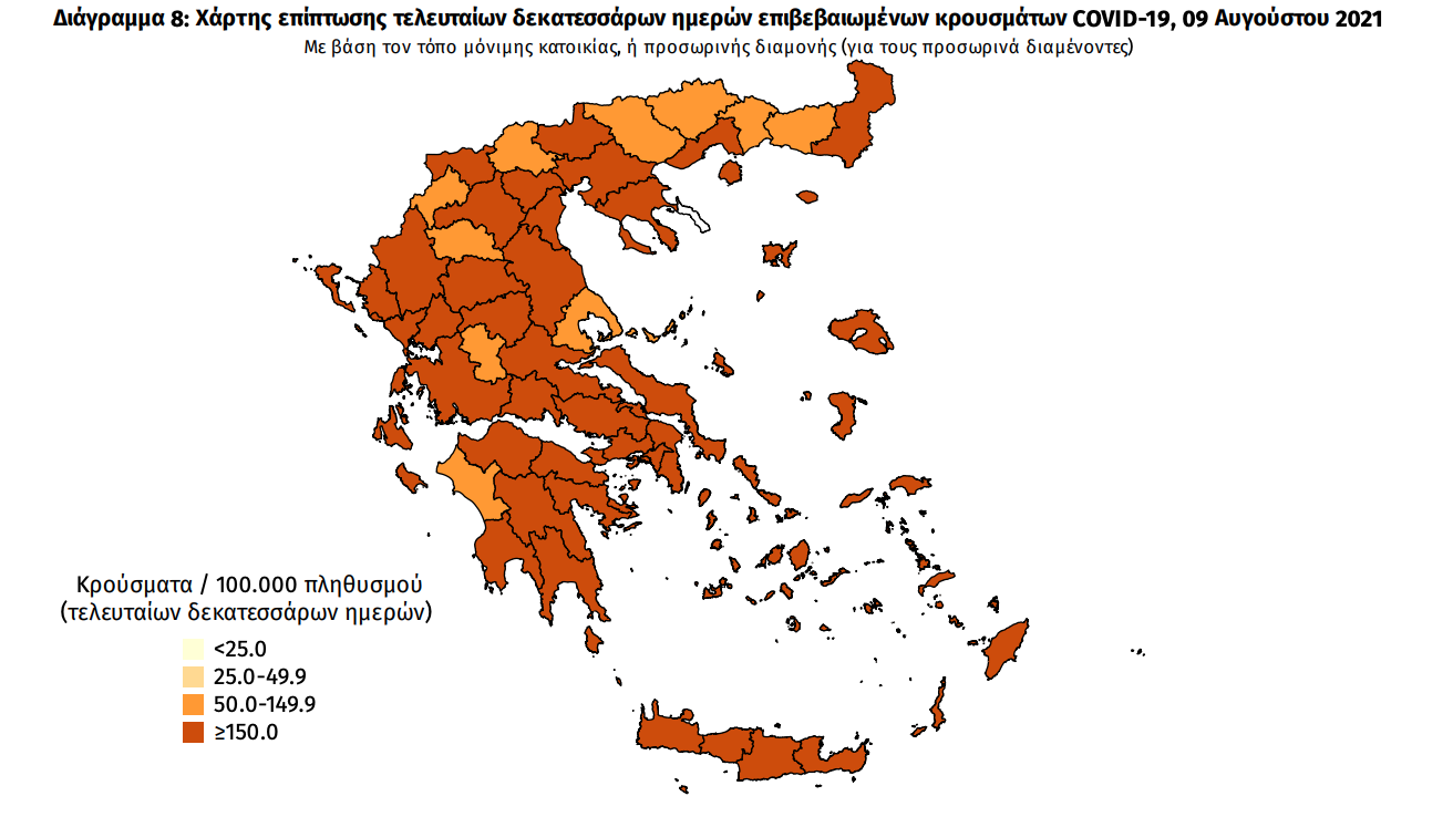 Τα στοιχεία που παρουσιάζονται αφορούν περιστατικά από την επιδημιολογική επιτήρηση της νόσου από το νέο κορωνοϊό (COVID19), με βάση τα δεδομένα που έχουν δηλωθεί στον ΕΟΔΥ και καταγραφεί μέχρι τις 09 Αυγούστου 2021 (ώρα 15:00). Τα νέα εργαστηριακά επιβεβαιωμένα κρούσματα της νόσου που καταγράφηκαν τις τελευταίες 24 ώρες είναι 2.595 , εκ των οποίων 9 εντοπίστηκαν κατόπιν ελέγχων στις πύλες εισόδου της χώρας.