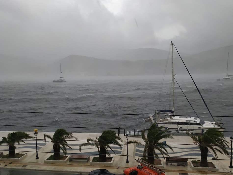 Θυελλώδεις άνεμοι που αγγίζουν και τα 10 μποφόρ και καταρρακτώδης βροχή πλήττουν περιοχές στο νησί.