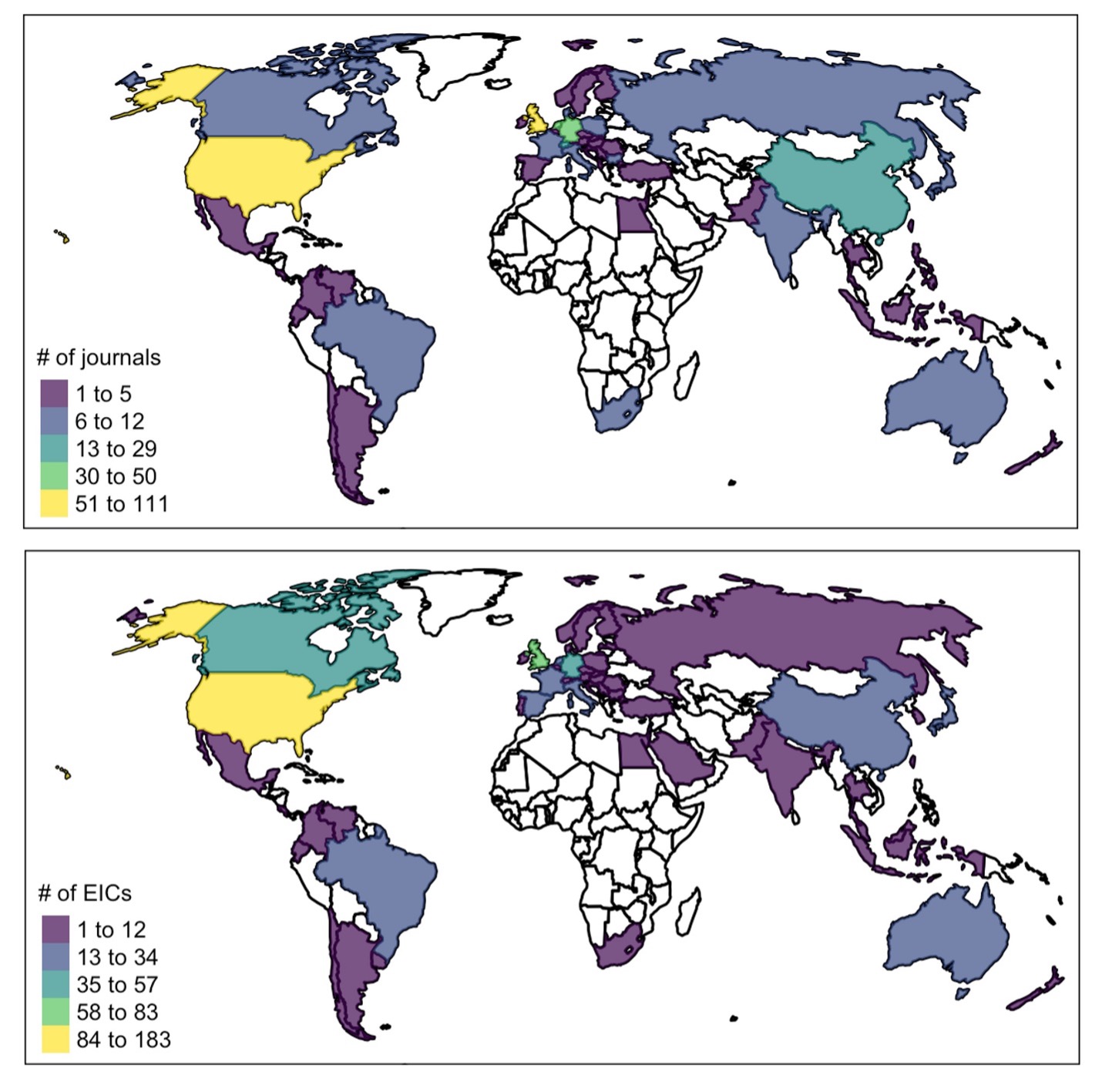 Οι ερευνητές εντόπισαν επιπλέον τις τοποθεσίες των περιοδικών και των αρχισυντακτών τους και βρήκαν ότι συγκεντρώνονται σε λίγα μόνο μέρη του κόσμου, που είναι τα ίδια με τα καλύτερα αποτελέσματα κατά τις αξιολογήσεις.